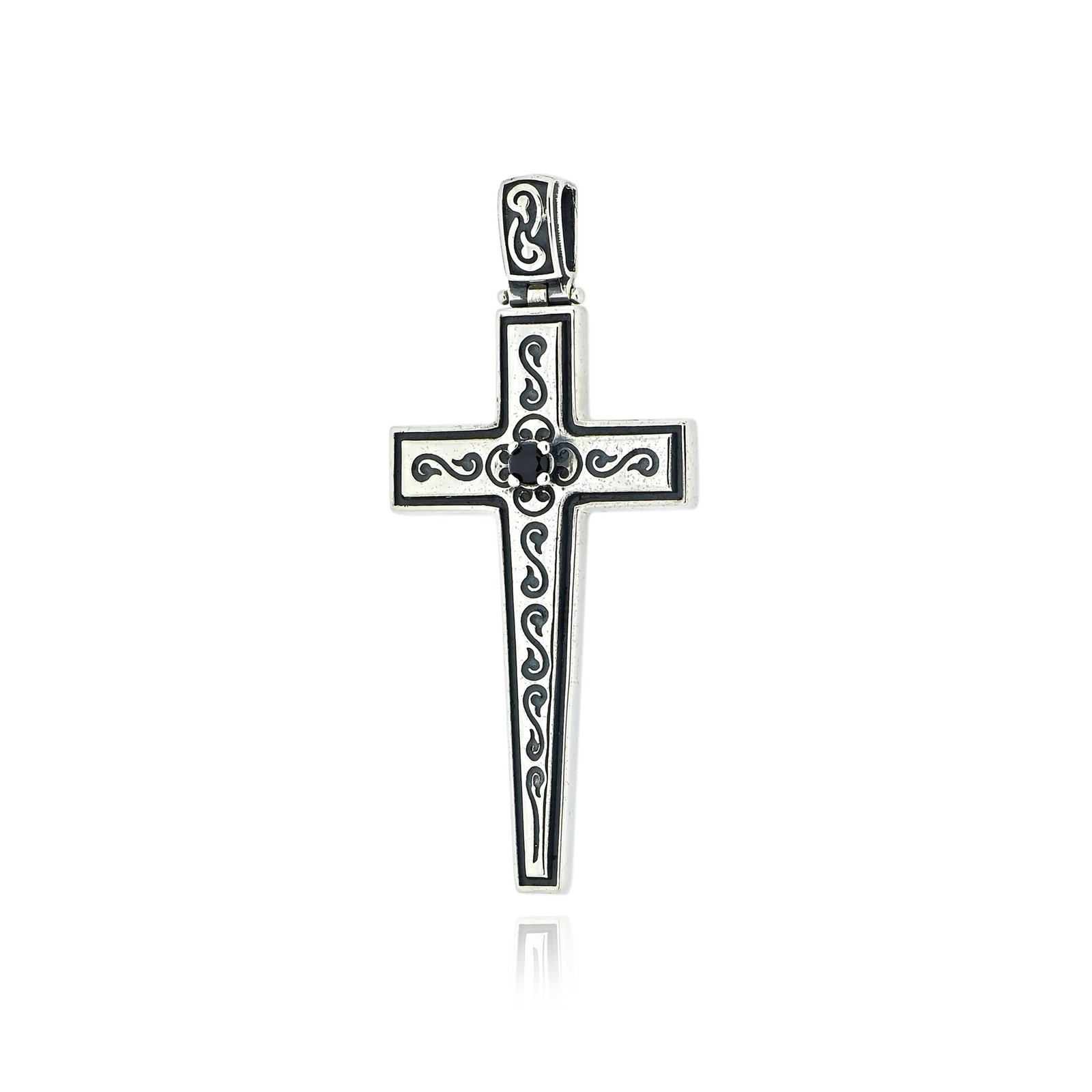 Ένας ανδρικός σταυρός από ασήμι 925 με ανάγλυφο διάκοσμο και οξειδωμένες λεπτομέρειες που προσδίδουν αίσθηση παλαιότητας και αυθεντικότητας. Στο κέντρο του ξεχωρίζει μια μαύρη πέτρα ζιργκόν, χαρίζοντας δυναμικό χαρακτήρα στο σχέδιο. Μια επιλογή με ιδιαίτερο στυλ, ιδανική για όσους αναζητούν ένα σύμβολο πίστης με μοναδικό σχεδιασμό.