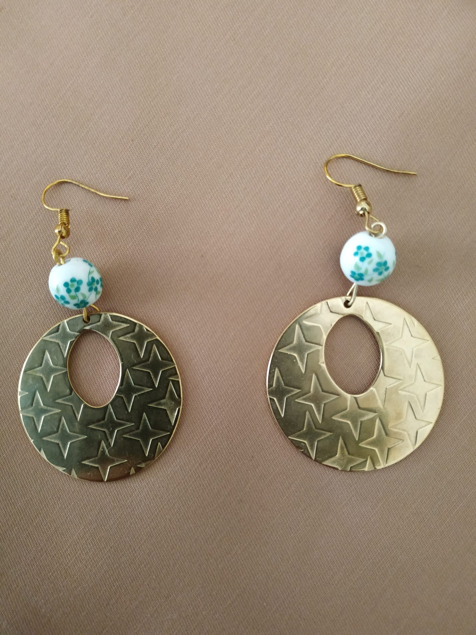 Κρεμαστά σκουλαρίκια με ατσάλινο στοιχείο κύκλο με αστέρια διαμέτρου 3,5εκ και στρογγυλή κεραμική χάντρα λευκή με πράσινα λουλούδια διαμέτρου 1εκατοστό. Έχουν μήκος περίπου 6εκ.