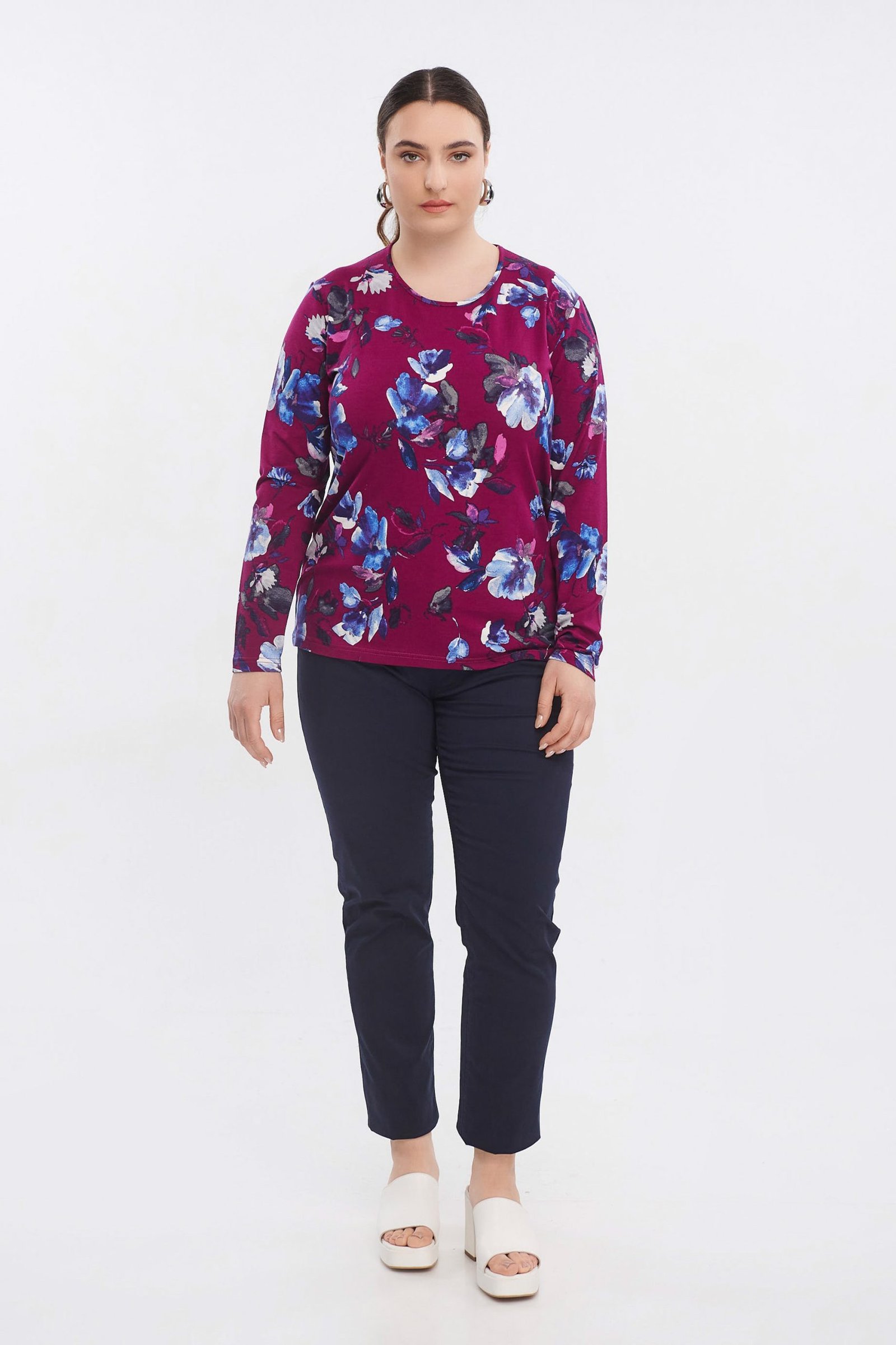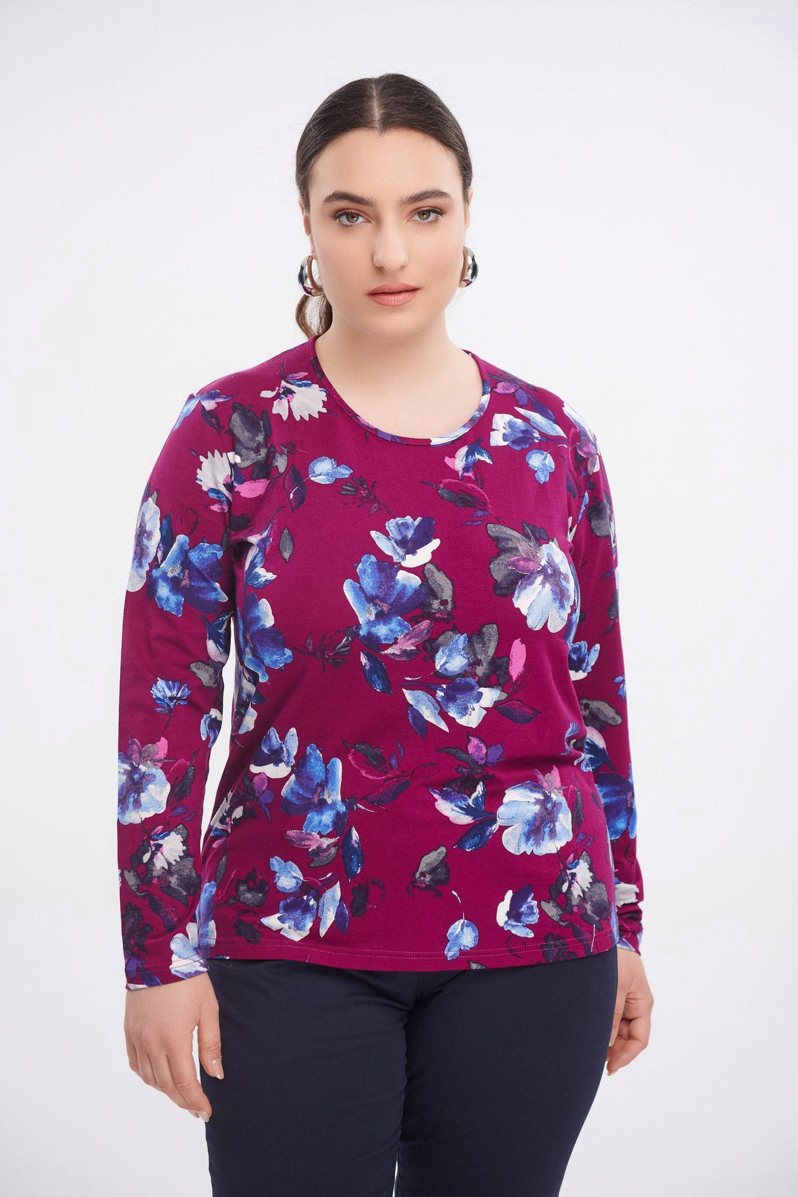 Μπλούζα από ύφασμα βισκόζης. Στρόγγυλη λαιμόκοψη και μακριά μανίκια. Μοντέρνο all over τύπωμα σε φλοράλ μοτίβο. Συνδυάστε την με jeans για ένα πιο casual look,αλλά και με φούστα. Η Σταυρούλα έχει ύψος 1,65, στήθος 107εκ και περιφέρεια 117εκ και φοράει xl.