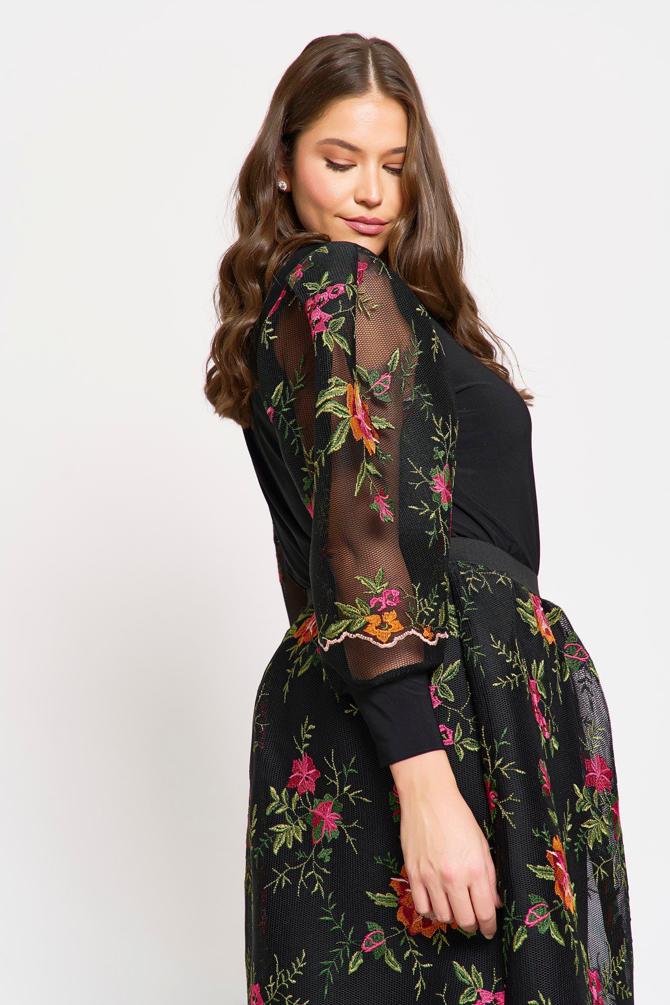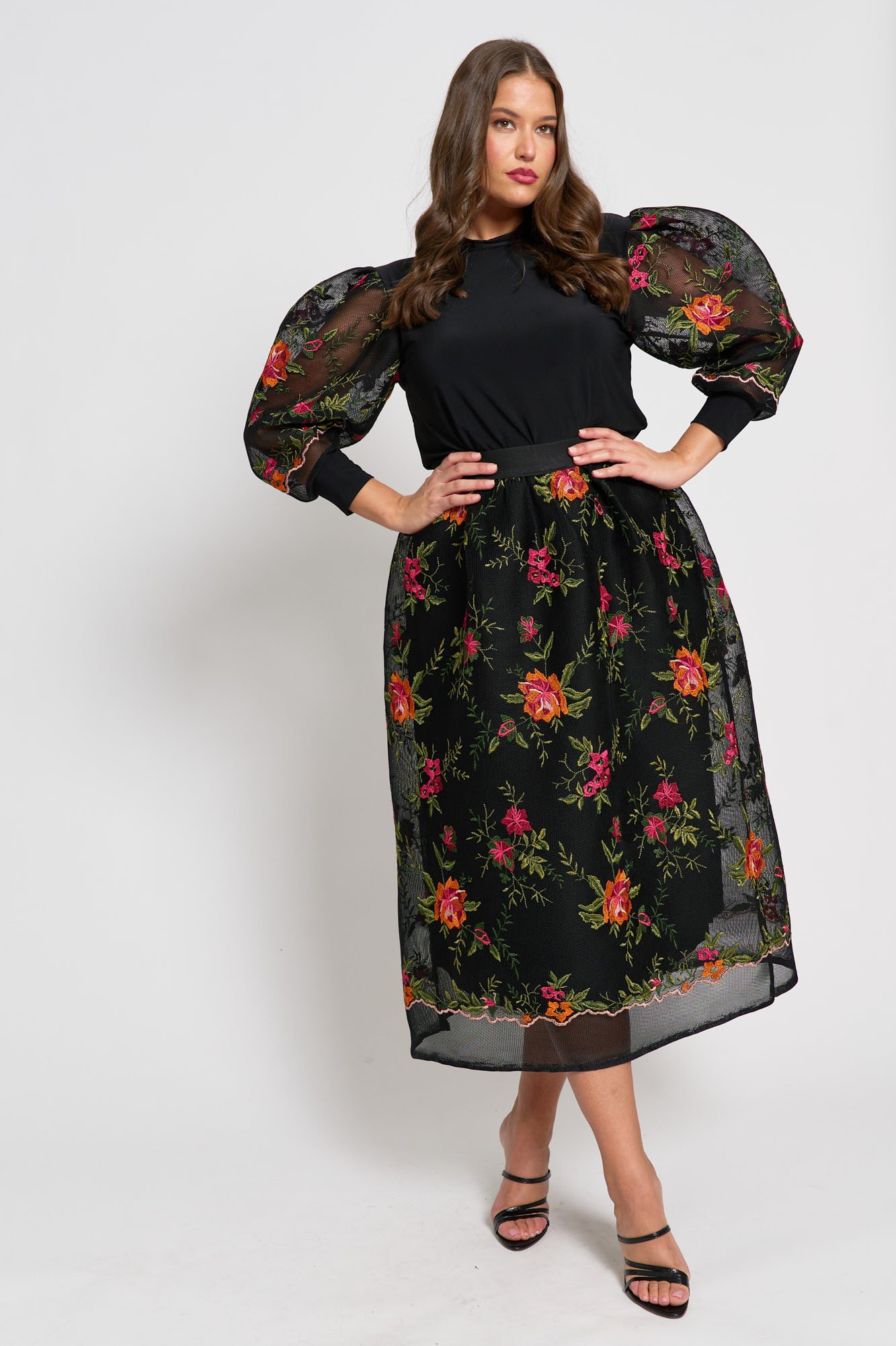 Κομψή ελαστική μπλούζα με διαφανή balloon μανίκια από τούλι, διακοσμημένα με λεπτομερές κέντημα λουλουδιών σε έντονα χρώματα. Λαιμόκοψη λουπέτο. Η άνετη γραμμή και οι ελαστικές μανσέτες προσφέρουν στυλ και λειτουργικότητα, καθιστώντας την ιδανική για ιδιαίτερες εμφανίσεις. Συνδυάστε την με την φούστα Alcmene για μία εντυπωσιακή total look εμφάνιση ή με μία μαύρη παντελόνα για μια πιο διακριτική επιλογή. Η Ιβάνα έχει ύψος 180εκ, στήθος 114εκ ,μέση 88εκ και περιφέρεια 121εκ και φοράει xl.