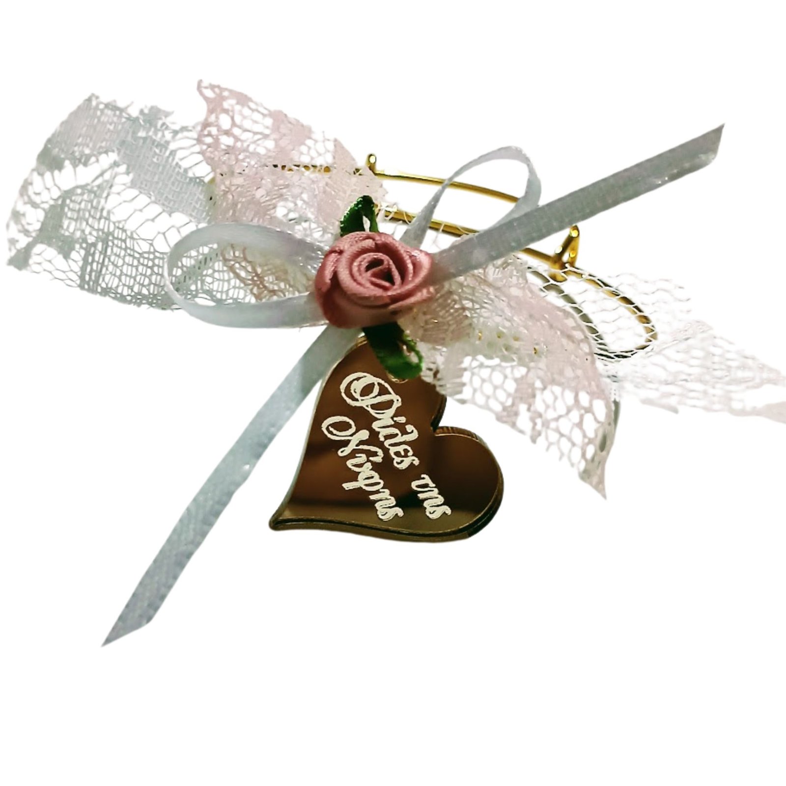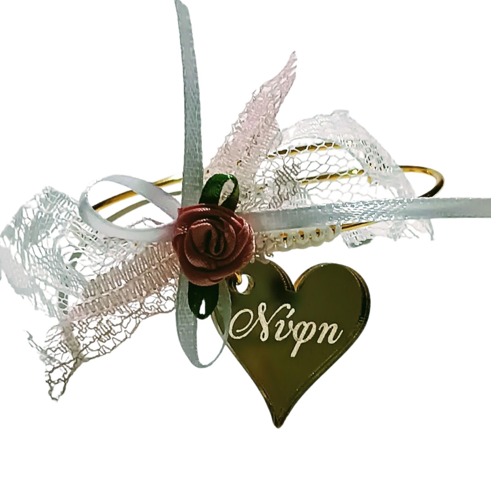 Χειροπέδα – βραχιόλι, με κεντρικό στοιχείο καρδιά από χρυσό καθρέφτη πλεξιγκλάς δεμένο με μακραμέ, λευκή κορδέλα, δαντέλες σε λευκό και σάπιο μήλο με υφασμάτινο λουλουδάκι σε σάπιο μήλο.