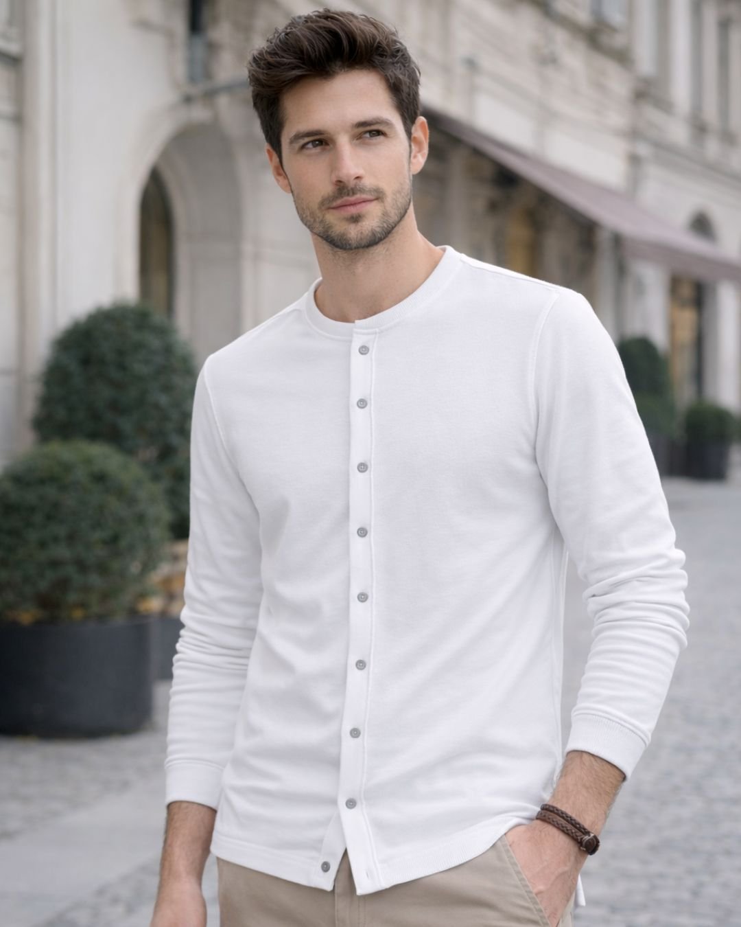 Modern fit T-shirt pattern with side slits and french front placket knits. round jewel neck with piping, long sleeves, sleeve piping