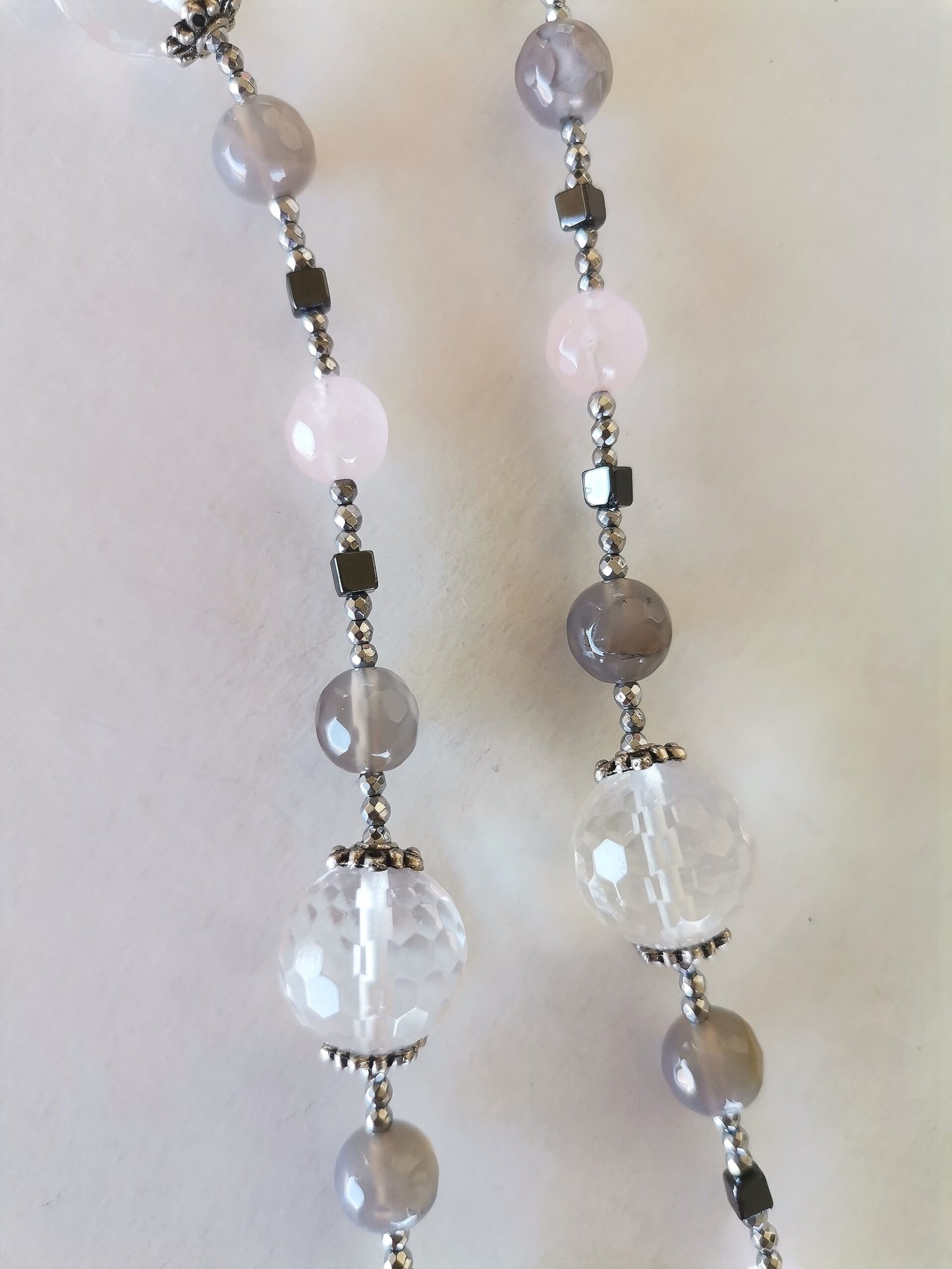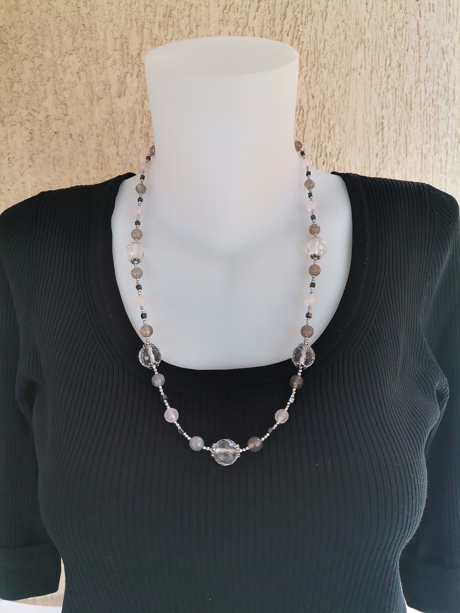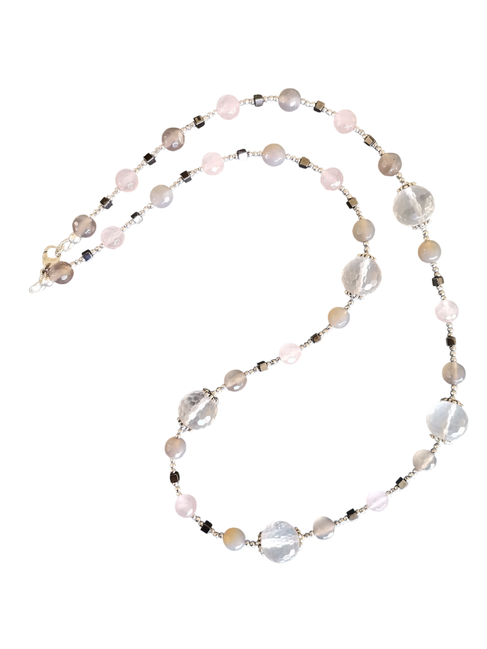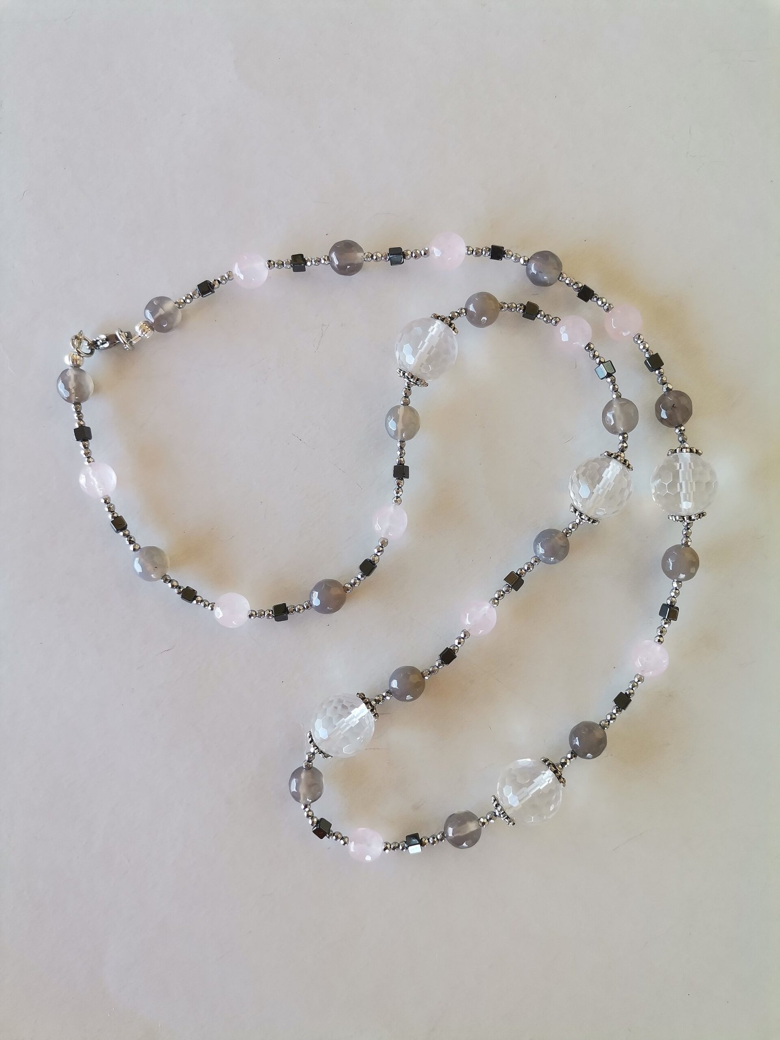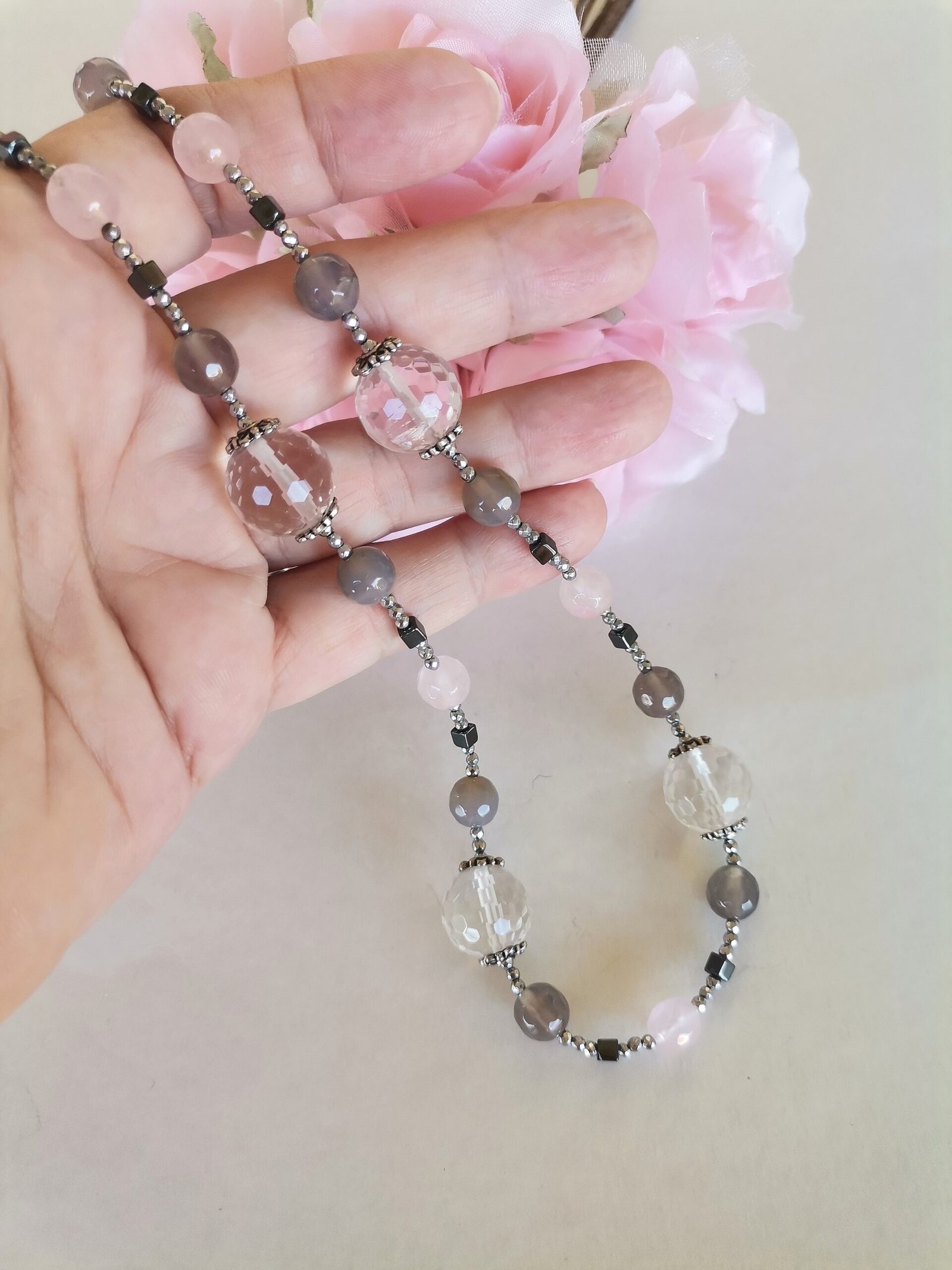 Κολιέ με διάφανο ροζ quartz ταγιέ 14mm, ροζ jade 8mm, γκρι αχάτη 8mm, αιματίτες ταγιέ σε ασημί χρώμα 2mm και φυσικό ανθρακί χρώμα σε κύβο 4mm, ροδέλες από zamak επάργυρες και ατσάλινο κούμπωμα.