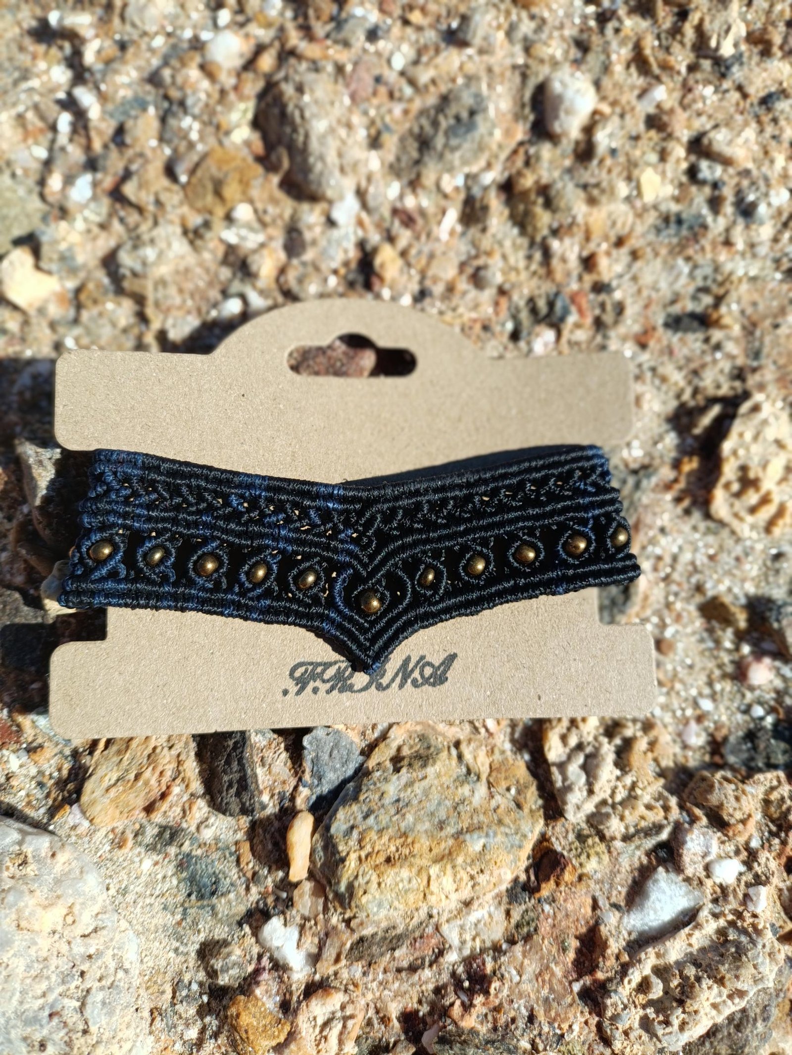 Μακραμέ βραχιόλι χεριού μαύρο-μπλε με μπρονζέ χάντρες