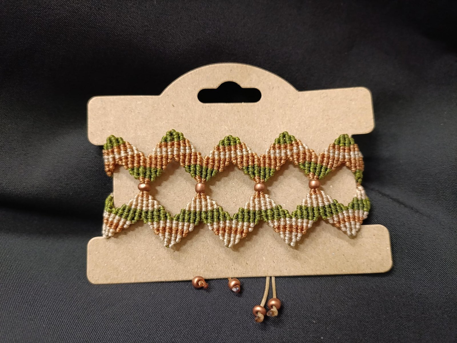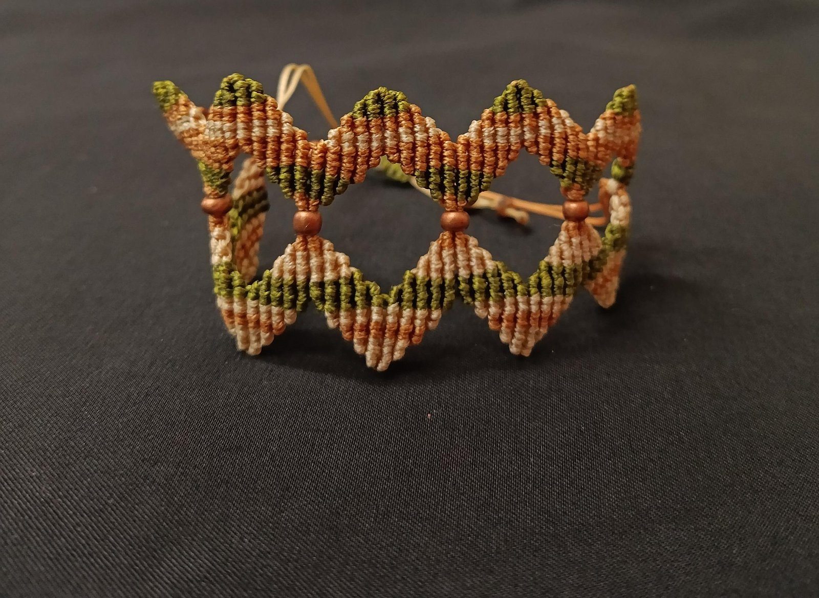 Μακραμέ βραχιόλι χεριού ζικ ζακ λαδί μπέζ μελί