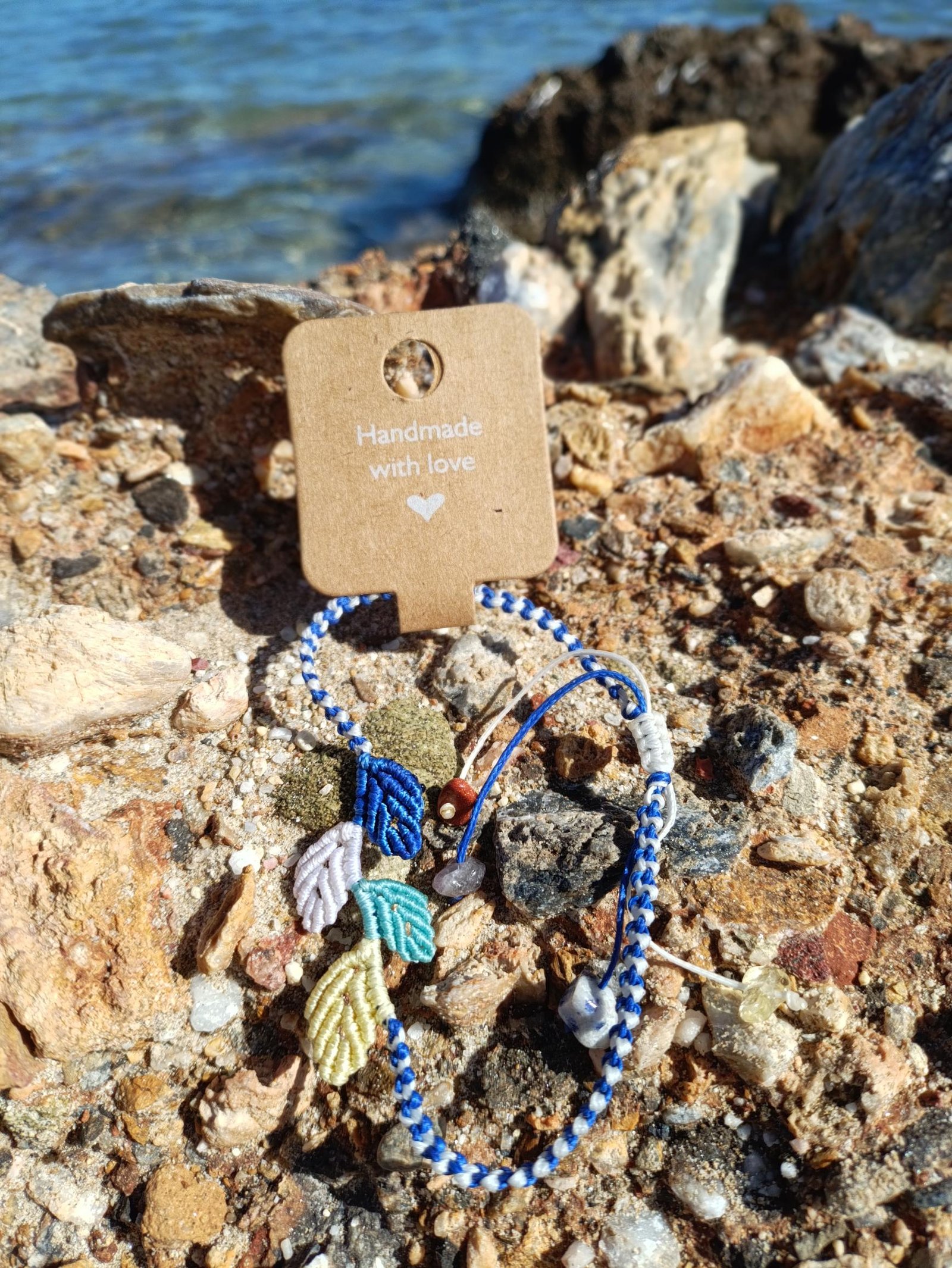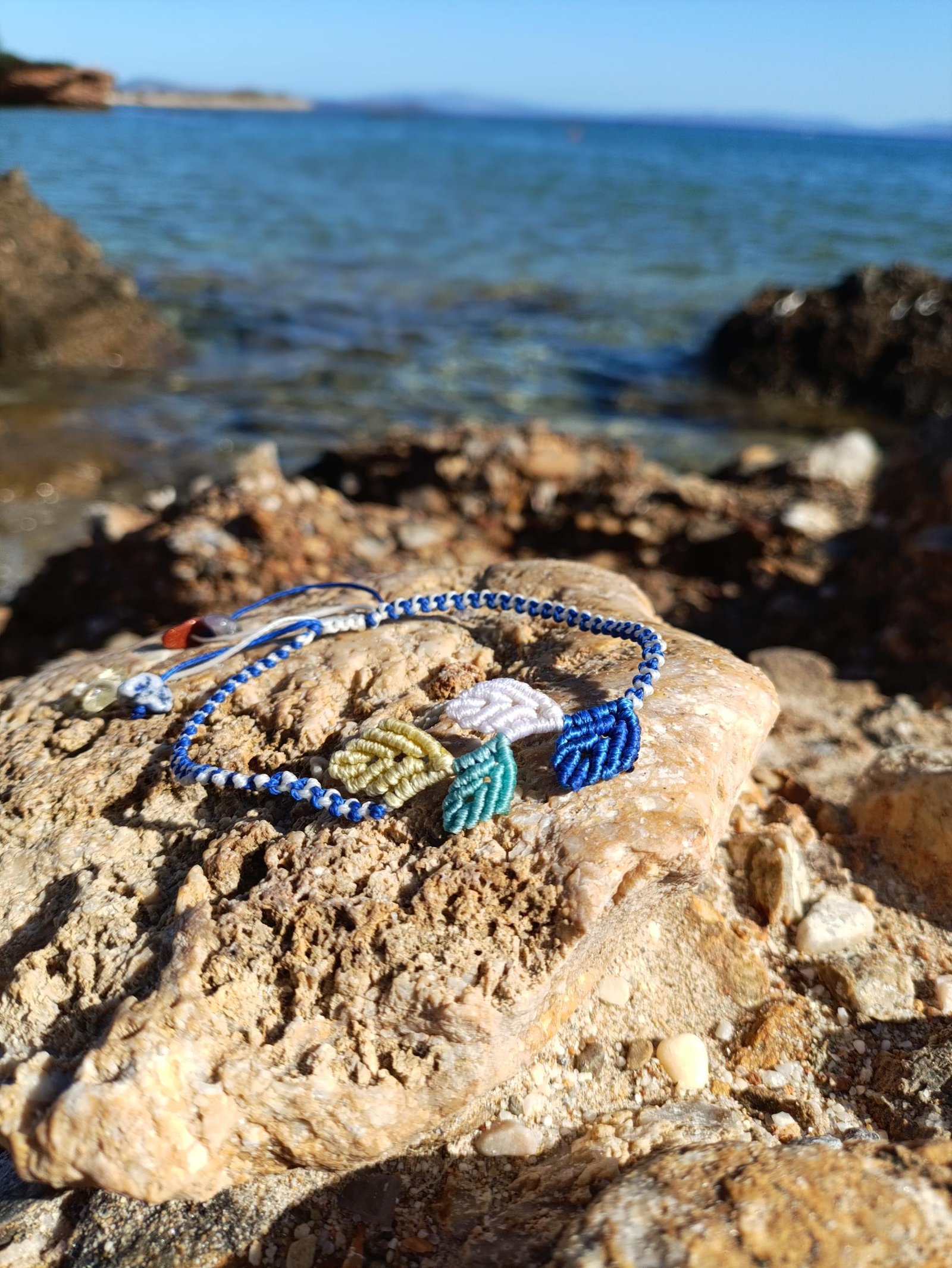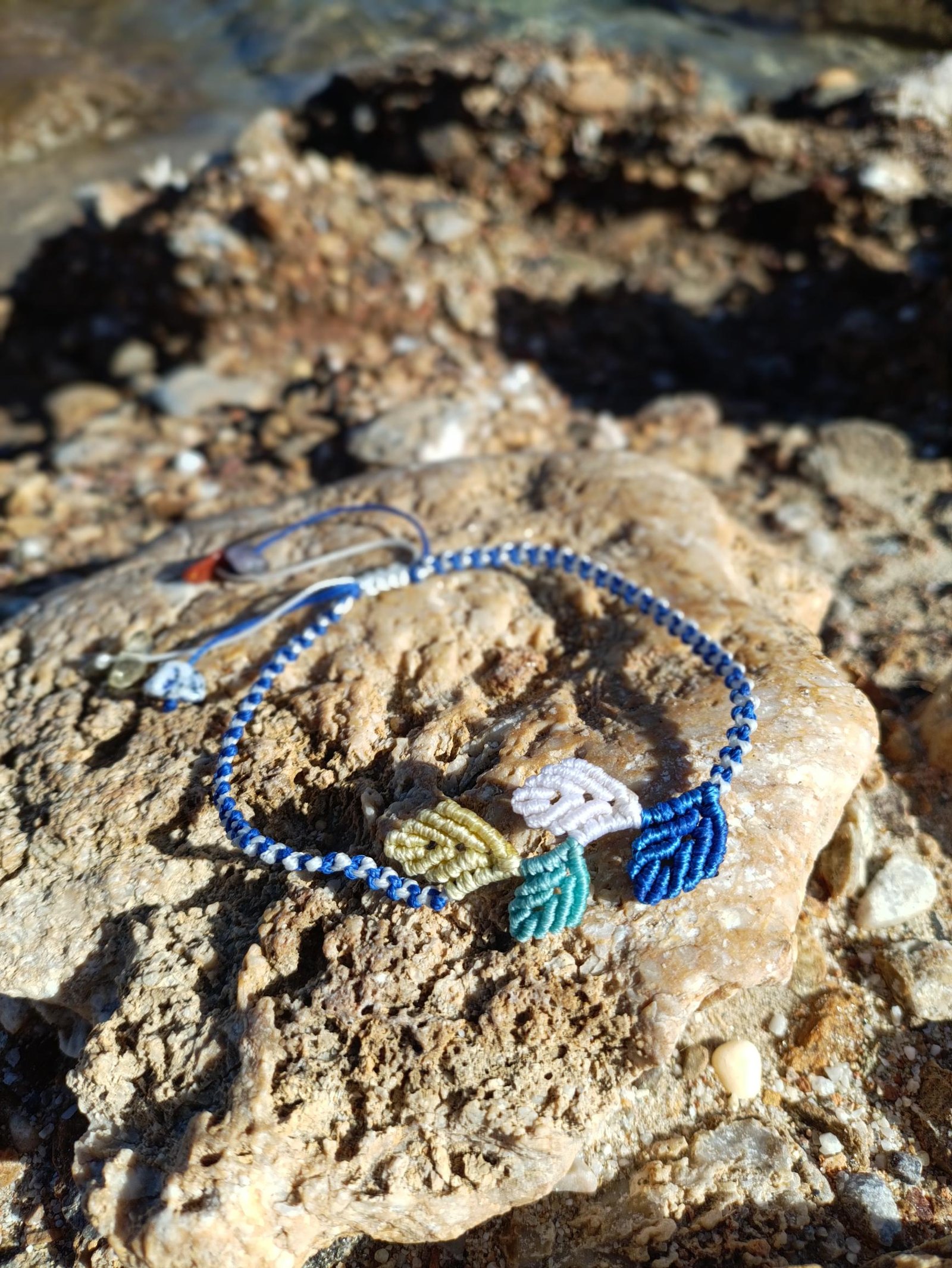 Μακραμέ βραχιόλι ποδιού μπλε-άσπρο με φύλλα χρωματιστά