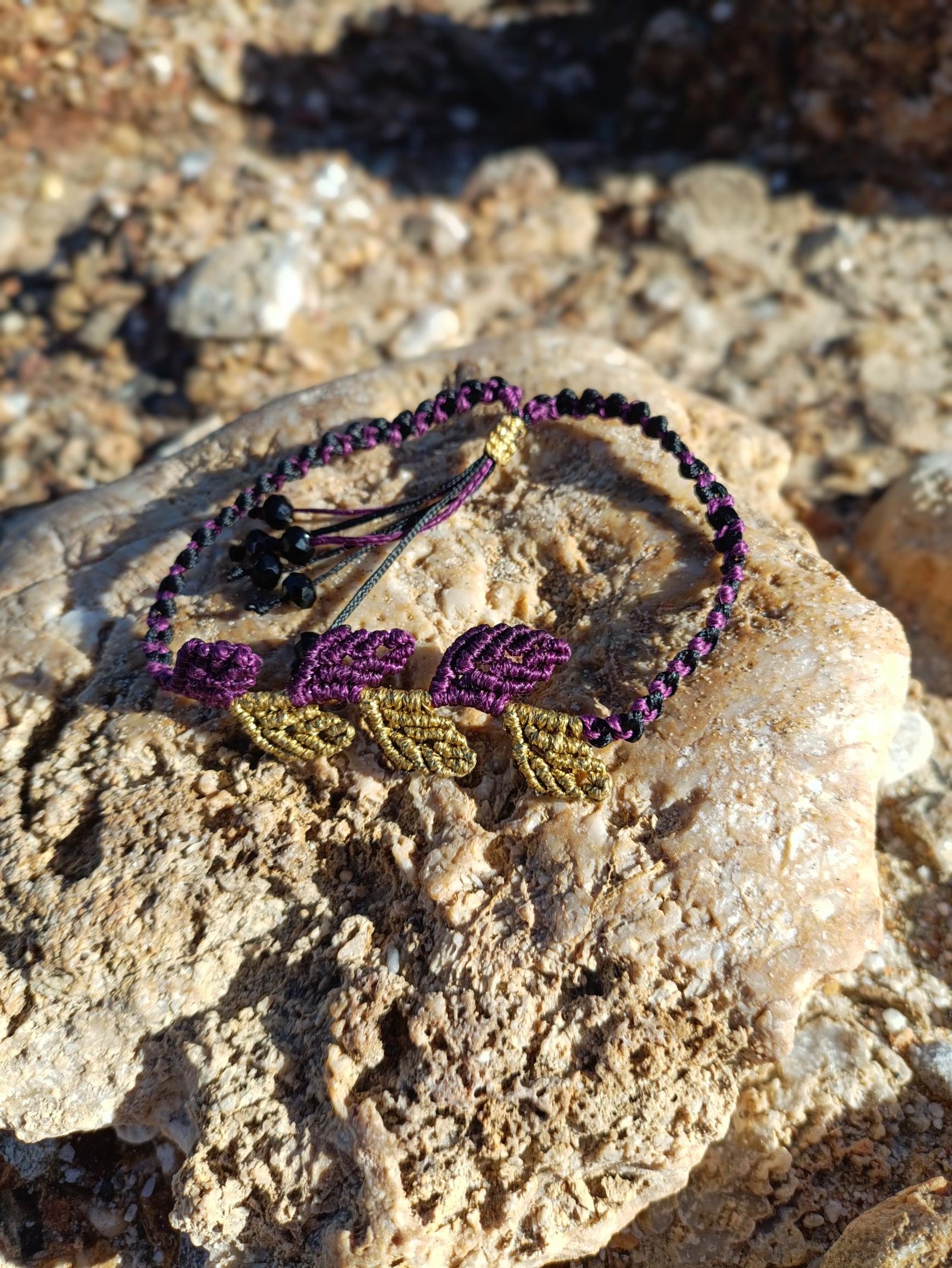 Μακραμέ βραχιόλι ποδιού με φύλλα μωβ-χρυσό