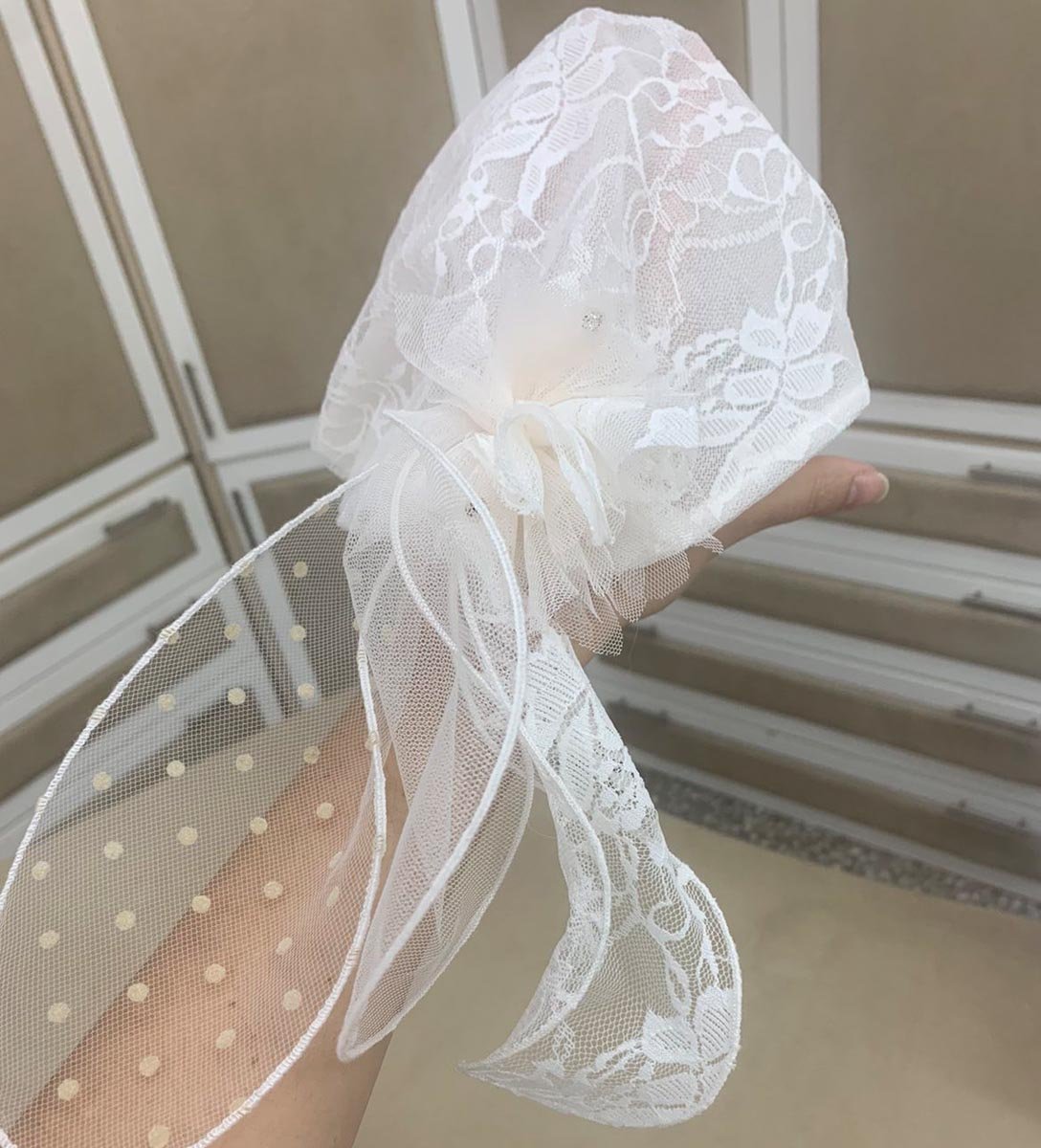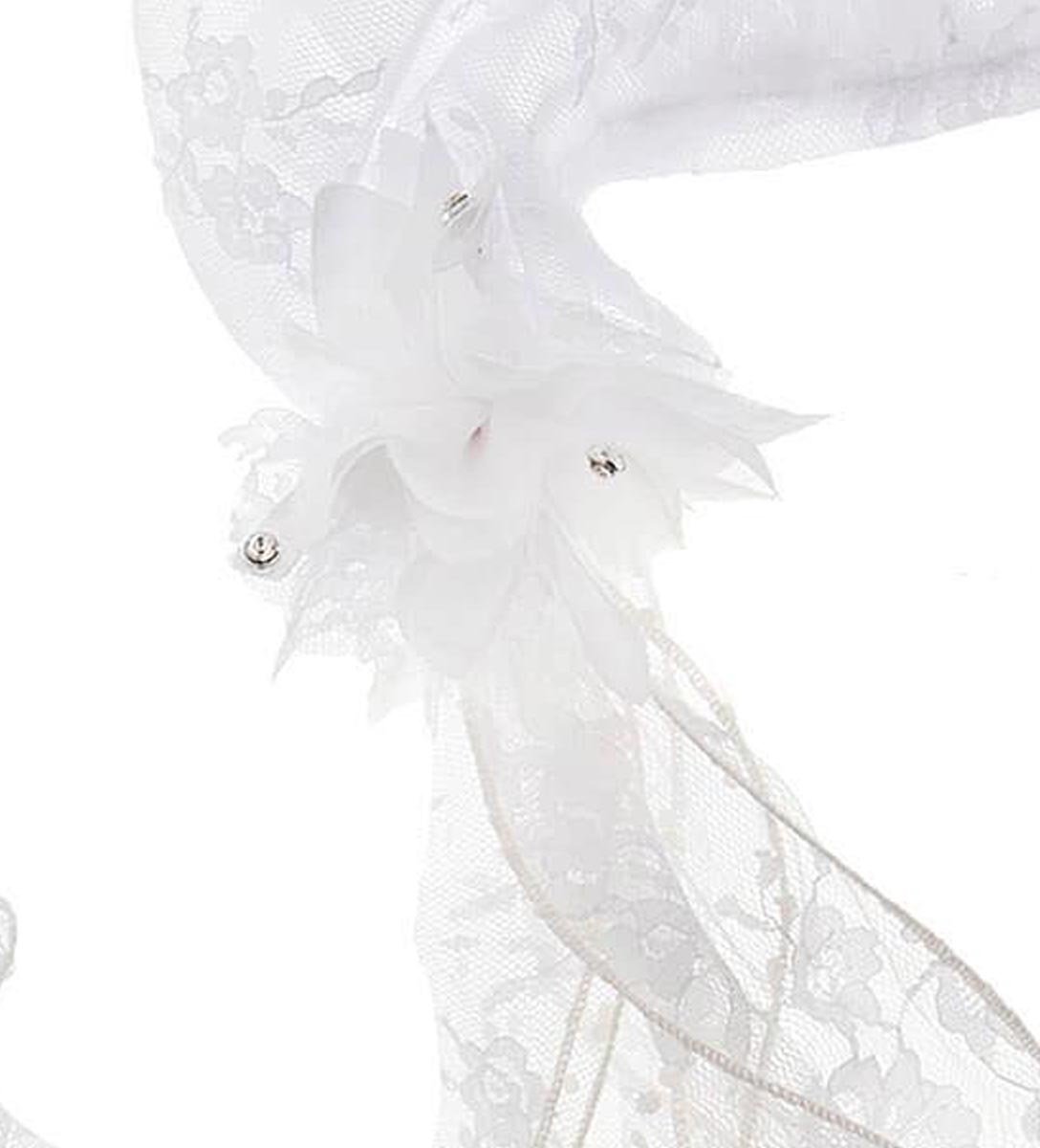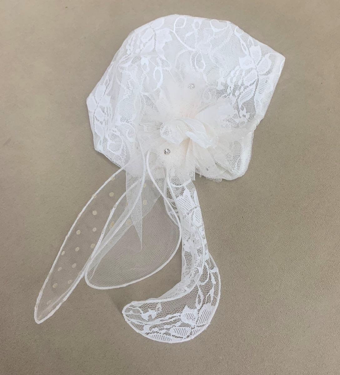 Φακιόλι βάπτισης. Ελληνικής παραγωγής. Φακιόλι από λευκή δαντέλα, με λάστιχο, ουρές από δαντέλα και τούλι και λουλούδι χειροποίητο με στρας.