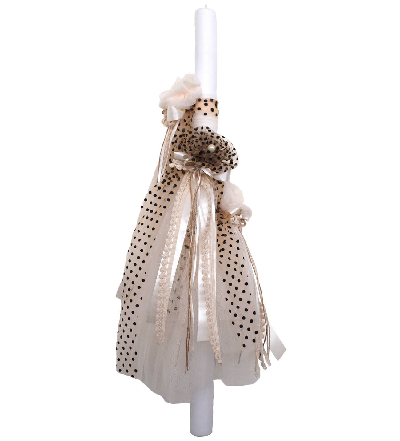 Λαμπάδα βάπτισης με τούλια μπεζ-μαύρα πουά και εκρού, τρία χειροποίητα λουλούδια και διακοσμητικές πέρλες. Ελληνικής κατασκευής. Ύψος λαμπάδας 0,80 μέτρα. Χρόνος καύσης κεριού 3 ώρες. Σχεδιασμένη ώστε να αντέχει στις υψηλές θερμοκρασίες κατά την αποστολή παραγγελίας. Συσκευάζεται έτσι ώστε να μην υπάρχει καμία φθορά στην μεταφορά της. Σε περίπτωση φθοράς κεριού κατά την μεταφορά, μας την επιστρέφετε και σας στέλνουμε καινούρια με δικά μας έξοδα μεταφοράς.