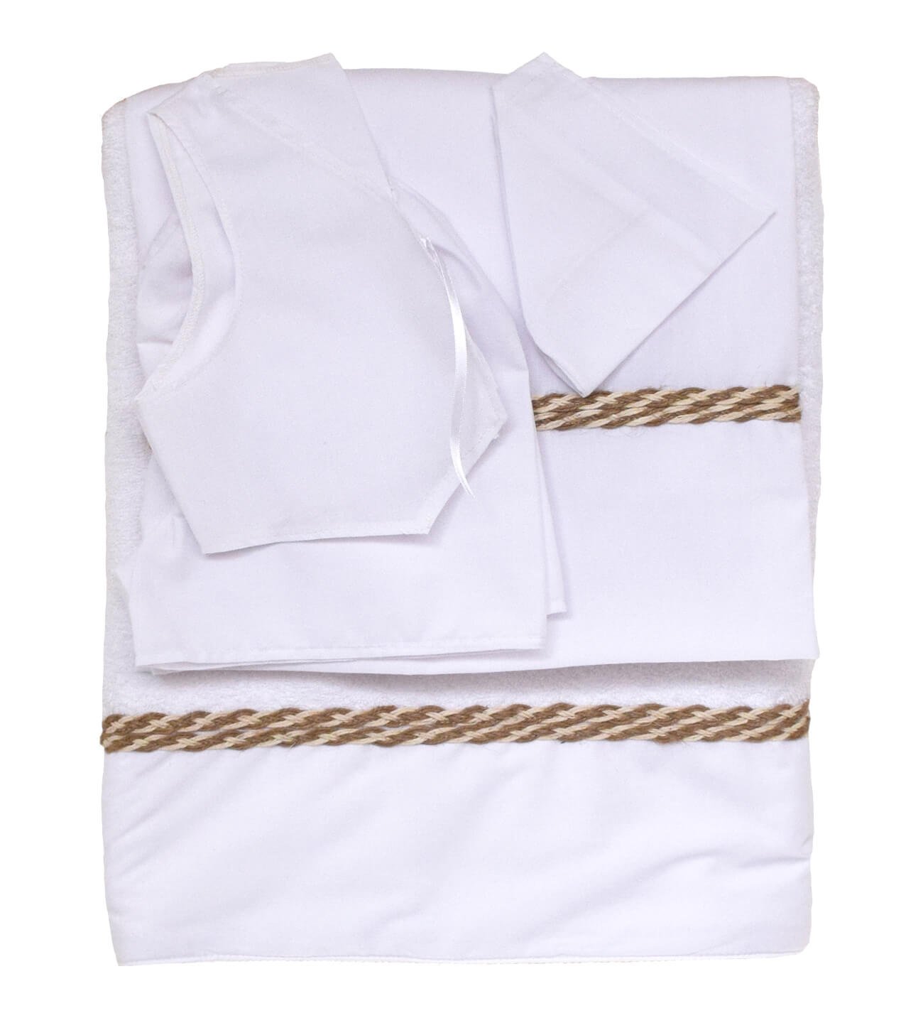 Λαδόπανα βάπτισης διακοσμημένα με κορδέλα σχοίνινης πλεξούδας, βαμβακερά, υποαλλεργικά. Περιέχουν: τα Εσώρουχα του παιδιού – την Πετσέτα του παιδιού – την Πετσέτα χεριών του παπά και του νονού-νονάς – το Σεντόνι του παιδιού. Για ηλικίες 0-3 χρόνων. Έτοιμα προς χρήση. Διαστάσεις πετσέτας: 1,40×70 Διαστάσεις σεντονιού: 1,30×90 Υπάρχει δυνατότητα να γράψουμε το όνομα ή το μονόγραμμα στην πετσέτα και το σεντόνι της βάπτισης.