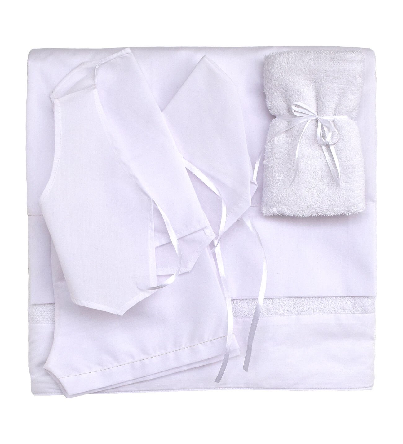 Λαδόπανα βάπτισης με ίσια φάσα λευκά, βαμβακερά, υποαλλεργικά. Περιέχουν: τα Εσώρουχα του παιδιού – την Πετσέτα του παιδιού – την Πετσέτα χεριών του παπά και του νονού-νονάς – το Σεντόνι του παιδιού. Για ηλικίες 0-3 χρόνων. Έτοιμα προς χρήση. Διαστάσεις πετσέτας: 1,40×70 Διαστάσεις σεντονιού: 1,20×90 Υπάρχει δυνατότητα να γράψουμε το όνομα ή το μονόγραμμα στην πετσέτα και το σεντόνι της βάπτισης.