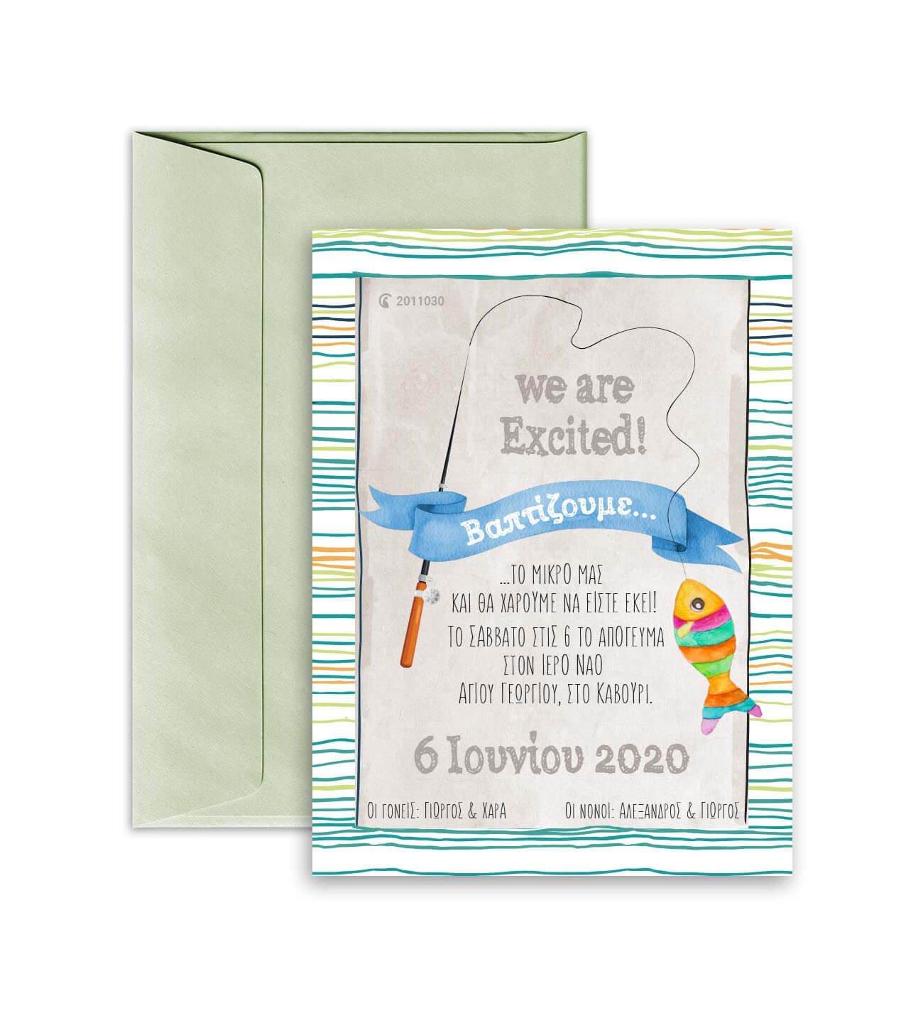 Προσκλητήριο βάπτισης, με θέμα ψαράκι πολύχρωμο. ΜΕ ΦΑΚΕΛΟ. Διαστάσεις: 14εκ. x 19εκ. (Υπάρχει περίπτωση το τελικό να αποκλείνει 5% από τις παραπάνω διαστάσεις) Υλικό χαρτιού: Οπαλίνα 300 γραμμαρίων Προσοχή: Για να ισχύει η αγορά του προϊόντος πρέπει να αγοράσετε και την ΜΑΚΕΤΑ. Χρειαζόμαστε 7-10 εργάσιμες για την παραγωγή τους, από τη δική σας έγκριση, μετά την παραλαβή της μακέτας. Παρακαλούμε στα σχόλια γράψτε μας τις πληροφορίες για το προσκλητήριο, για γρηγορότερη παραγωγή μακέτας. 2011030