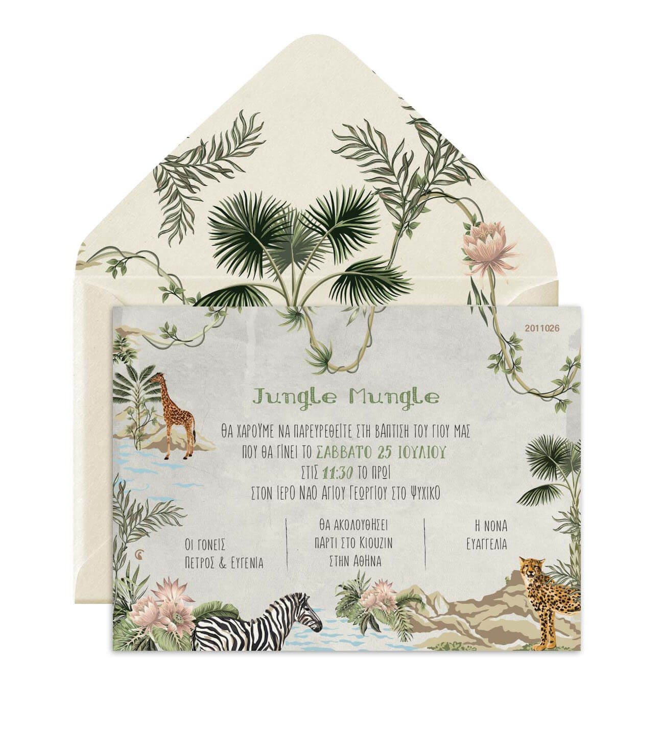 Προσκλητήριο βάπτισης, με θέμα ζούγκλα. ΜΕ ΦΑΚΕΛΟ. Διαστάσεις: 19εκ. x 14εκ. (Υπάρχει περίπτωση το τελικό να αποκλείνει 5% από τις παραπάνω διαστάσεις) Υλικό χαρτιού: Οπαλίνα 300 γραμμαρίων Προσοχή: Για να ισχύει η αγορά του προϊόντος πρέπει να αγοράσετε και την ΜΑΚΕΤΑ. Χρειαζόμαστε 7-10 εργάσιμες για την παραγωγή τους, από τη δική σας έγκριση, μετά την παραλαβή της μακέτας. Παρακαλούμε στα σχόλια γράψτε μας τις πληροφορίες για το προσκλητήριο, για γρηγορότερη παραγωγή μακέτας. 2011026