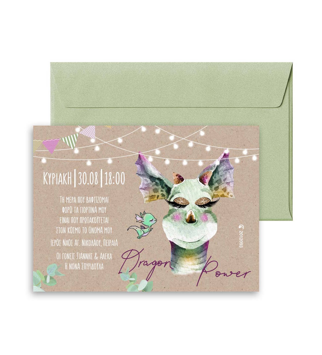 Προσκλητήριο βάπτισης, με θέμα το δράκο. ΜΕ ΦΑΚΕΛΟ. Διαστάσεις: 19εκ. x 14εκ. (Υπάρχει περίπτωση το τελικό να αποκλείνει 5% από τις παραπάνω διαστάσεις) Υλικό χαρτιού: Οπαλίνα 300 γραμμαρίων Προσοχή: Για να ισχύει η αγορά του προϊόντος πρέπει να αγοράσετε και την ΜΑΚΕΤΑ. Χρειαζόμαστε 7-10 εργάσιμες για την παραγωγή τους, από τη δική σας έγκριση, μετά την παραλαβή της μακέτας. Παρακαλούμε στα σχόλια γράψτε μας τις πληροφορίες για το προσκλητήριο, για γρηγορότερη παραγωγή μακέτας. 2012093