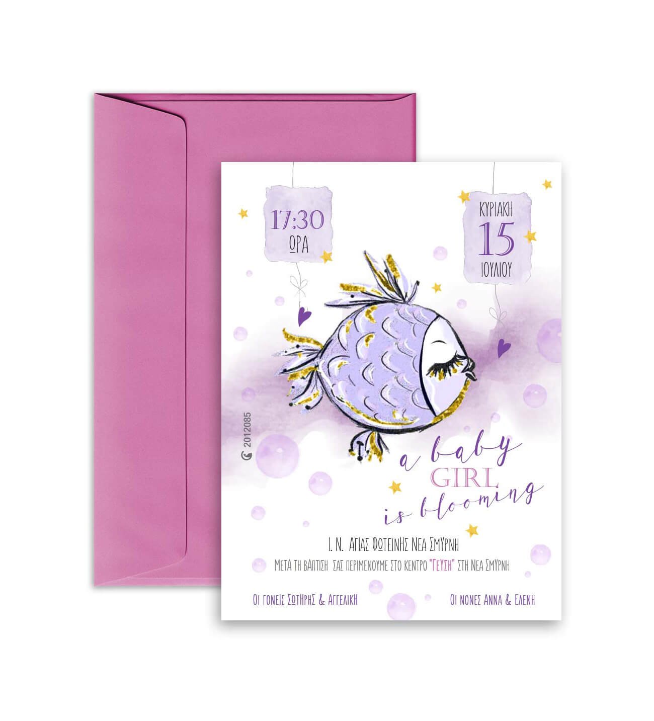 Προσκλητήριο βάπτισης, με θέμα ψαράκι. ΜΕ ΦΑΚΕΛΟ. Διαστάσεις: 14εκ. x 19εκ. (Υπάρχει περίπτωση το τελικό να αποκλείνει 5% από τις παραπάνω διαστάσεις) Υλικό χαρτιού: Οπαλίνα 300 γραμμαρίων Προσοχή: Για να ισχύει η αγορά του προϊόντος πρέπει να αγοράσετε και την ΜΑΚΕΤΑ. Χρειαζόμαστε 7-10 εργάσιμες για την παραγωγή τους, από τη δική σας έγκριση, μετά την παραλαβή της μακέτας. Παρακαλούμε στα σχόλια γράψτε μας τις πληροφορίες για το προσκλητήριο, για γρηγορότερη παραγωγή μακέτας. 2012085
