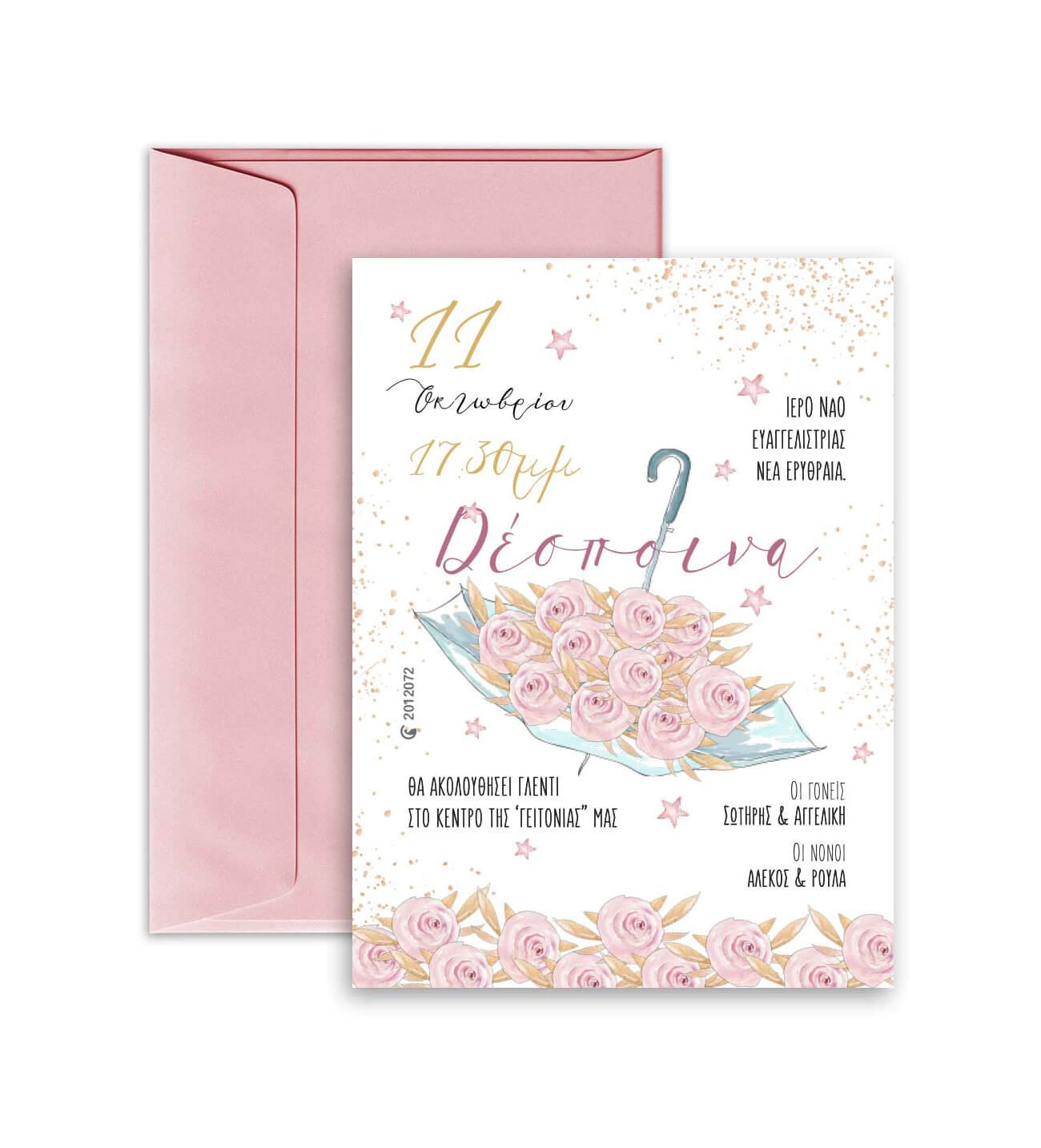 Προσκλητήριο βάπτισης, με θέμα ομπρέλα. ΜΕ ΦΑΚΕΛΟ. Διαστάσεις: 14εκ. x 19εκ. (Υπάρχει περίπτωση το τελικό να αποκλείνει 5% από τις παραπάνω διαστάσεις) Υλικό χαρτιού: Οπαλίνα 300 γραμμαρίων Προσοχή: Για να ισχύει η αγορά του προϊόντος πρέπει να αγοράσετε και την ΜΑΚΕΤΑ. Χρειαζόμαστε 7-10 εργάσιμες για την παραγωγή τους, από τη δική σας έγκριση, μετά την παραλαβή της μακέτας. Παρακαλούμε στα σχόλια γράψτε μας τις πληροφορίες για το προσκλητήριο, για γρηγορότερη παραγωγή μακέτας. 2012072