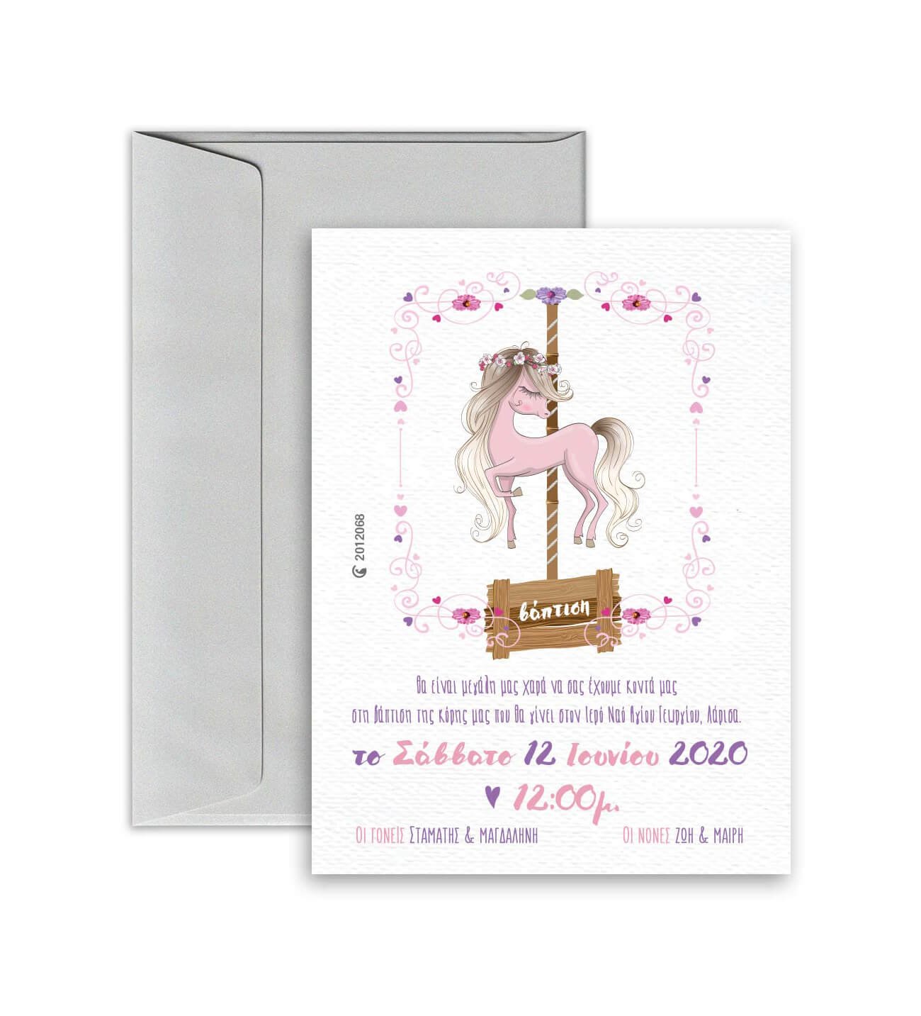 Προσκλητήριο βάπτισης, με θέμα καρουζέλ. ΜΕ ΦΑΚΕΛΟ. Διαστάσεις: 14εκ. x 19εκ. (Υπάρχει περίπτωση το τελικό να αποκλείνει 5% από τις παραπάνω διαστάσεις) Υλικό χαρτιού: Οπαλίνα 300 γραμμαρίων Προσοχή: Για να ισχύει η αγορά του προϊόντος πρέπει να αγοράσετε και την ΜΑΚΕΤΑ. Χρειαζόμαστε 7-10 εργάσιμες για την παραγωγή τους, από τη δική σας έγκριση, μετά την παραλαβή της μακέτας. Παρακαλούμε στα σχόλια γράψτε μας τις πληροφορίες για το προσκλητήριο, για γρηγορότερη παραγωγή μακέτας. 2012068