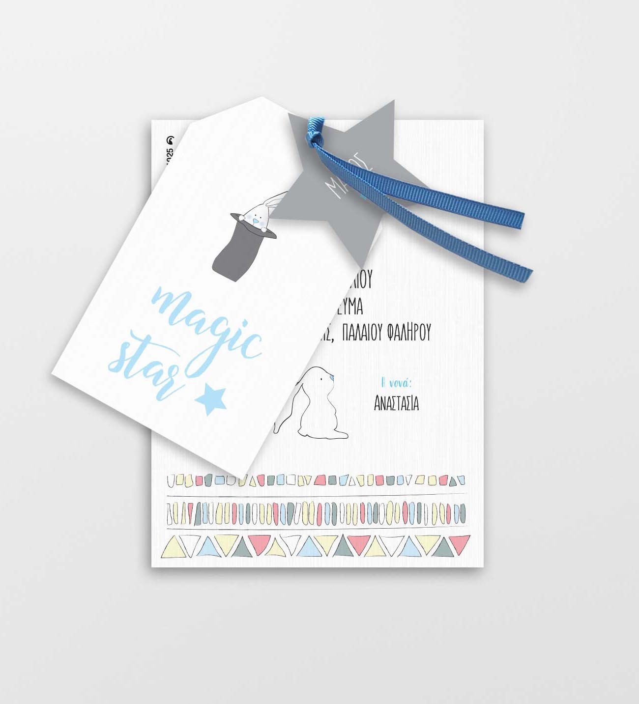 Προσκλητήριο βάπτισης, με θέμα λαγουδάκι. Διαστάσεις: 12εκ. x 16εκ. , το πίσω χαρτί (Υπάρχει περίπτωση το τελικό να αποκλείνει 5% από τις παραπάνω διαστάσεις) Υλικό χαρτιού: Οπαλίνα 300 γραμμαρίων Προσοχή: Για να ισχύει η αγορά του προϊόντος πρέπει να αγοράσετε και την ΜΑΚΕΤΑ. Χρειαζόμαστε 7-10 εργάσιμες για την παραγωγή τους, από τη δική σας έγκριση, μετά την παραλαβή της μακέτας. Παρακαλούμε στα σχόλια γράψτε μας τις πληροφορίες για το προσκλητήριο, για γρηγορότερη παραγωγή μακέτας. 2111007