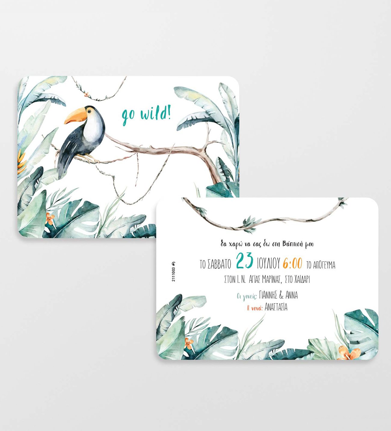 Προσκλητήριο βάπτισης, με θέμα ζούγκλα. Διαστάσεις: 19εκ. x 14εκ. (Υπάρχει περίπτωση το τελικό να αποκλείνει 5% από τις παραπάνω διαστάσεις) Υλικό χαρτιού: Οπαλίνα 300 γραμμαρίων Προσοχή: Για να ισχύει η αγορά του προϊόντος πρέπει να αγοράσετε και την ΜΑΚΕΤΑ. Χρειαζόμαστε 7-10 εργάσιμες για την παραγωγή τους, από τη δική σας έγκριση, μετά την παραλαβή της μακέτας. Παρακαλούμε στα σχόλια γράψτε μας τις πληροφορίες για το προσκλητήριο, για γρηγορότερη παραγωγή μακέτας. 2111003