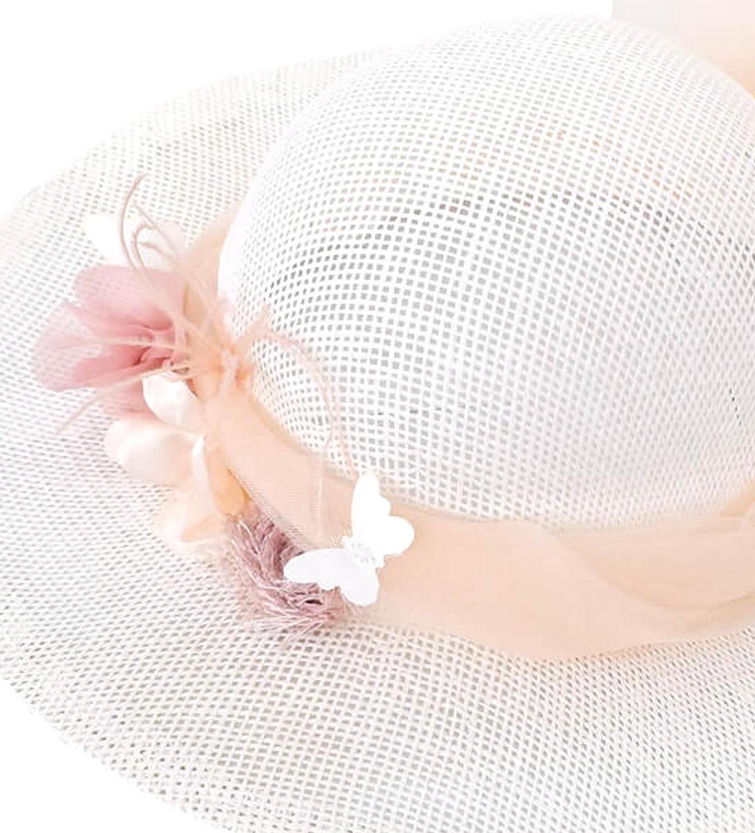 Ψάθινο καπέλο βάπτισης λευκό, με σομόν τούλι, λουλούδια, φτερά, πεταλούδα και διακοσμητικές πέρλες, ελληνικής παραγωγής. Βαπτιστικά ρούχα, ελληνικής ραφής, υψηλής ποιότητας. Παράγονται στον επαγγελματικό μας χώρο κατά παραγγελία στα μέτρα του παιδιού.