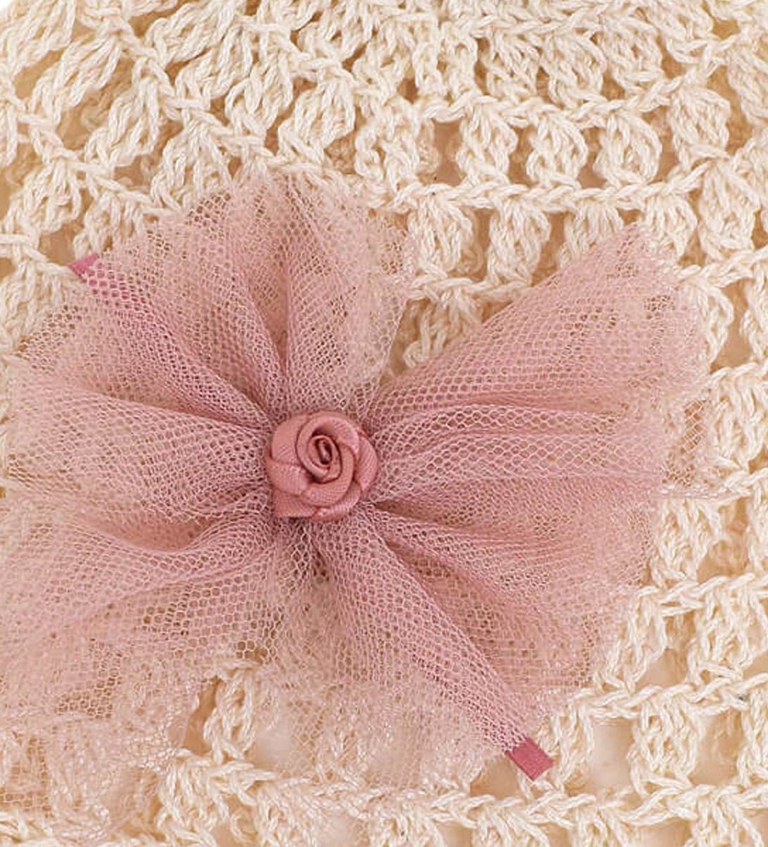 Σκουφάκι βάπτισης, πλεκτό στο χέρι από εκρού βαμβακερό νήμα με τούλινο ροζ φιογκάκι και άνθος. Ελληνικής παραγωγής.