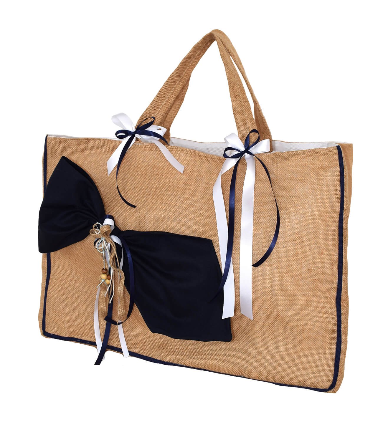 Υφασμάτινη τσάντα βάπτισης από λινάτσα, κορδέλες μπλε-λευκές και φιόγκους από μπλέ ύφασμα καπαρτίνα , ελληνικής κατασκευής. Με αρκετό χώρο ώστε να χωράει τα ολοκληρωμένα βαπτιστικά πακέτα. Χρησιμοποιείται αργότερα για κουτί παιχνιδιών ή αποθηκευτικό χώρο.