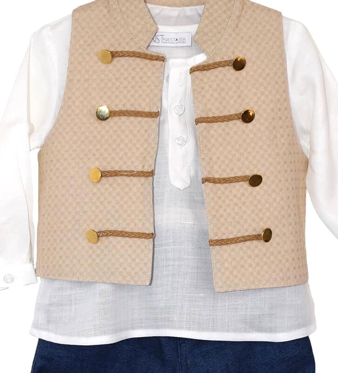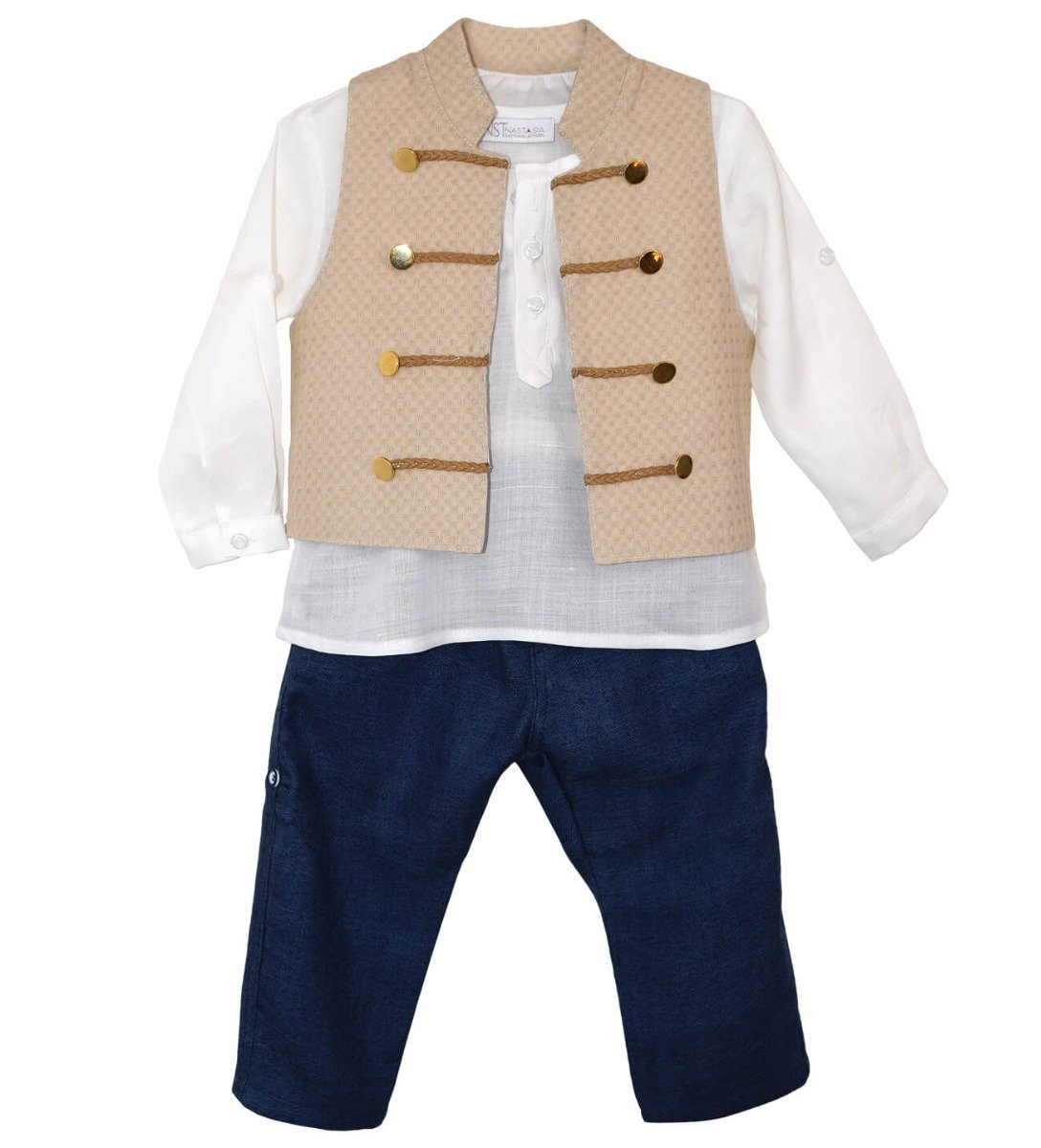 Βαπτιστικά ρούχα, ελληνικής ραφής, υψηλής ποιότητας. Παράγονται στον επαγγελματικό μας χώρο κατά παραγγελία στα μέτρα του παιδιού. Βαπτιστικό ρούχο με πουκαμίσα λινή εκρού, γιλέκο βαμβακερό πικέ με χρυσά κουμπιά (μιλιτέρ) και παντελόνι τσεπάκι εμπρός με κουμπιά λινό χοντρό ραφ.
