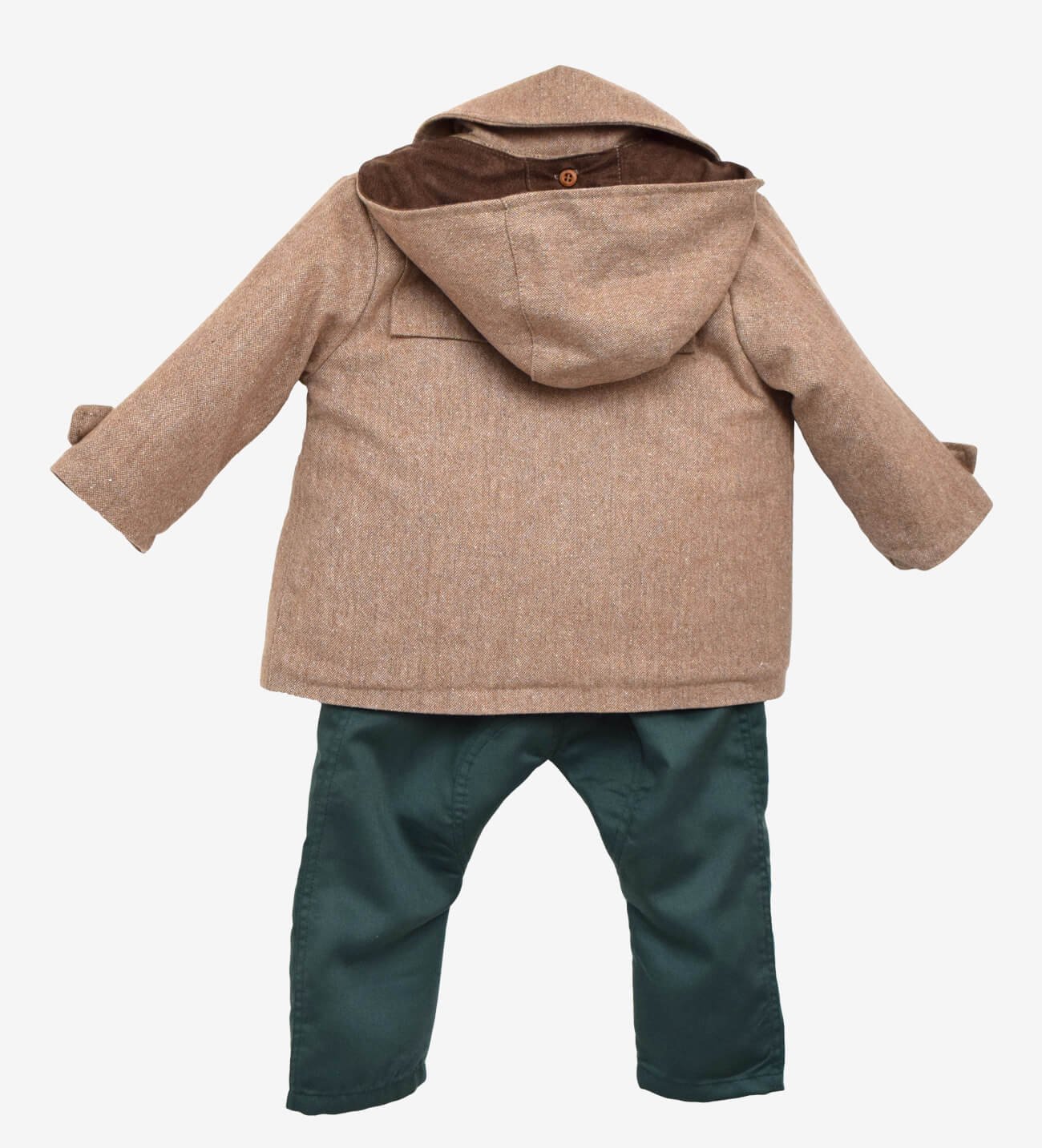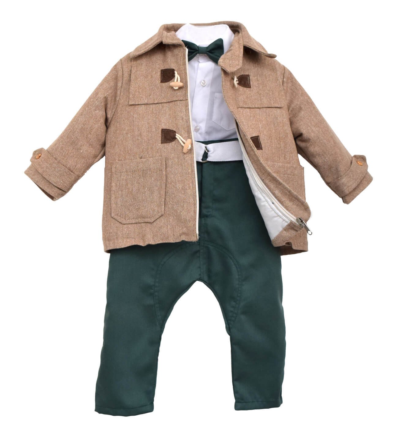 Βαπτιστικά ρούχα από μπουφάν μοντγκόμερι σε μπεζ απόχρωση, με καφέ δερμάτινα-σχοίνινα κουμπώματα και πράσινο skinny παντελόνι, ελληνικής ραφής, υψηλής ποιότητας. Παράγονται στον επαγγελματικό μας χώρο κατά παραγγελία στα μέτρα του παιδιού. Βαπτιστικό ρούχο με Μοντγκόμερι.