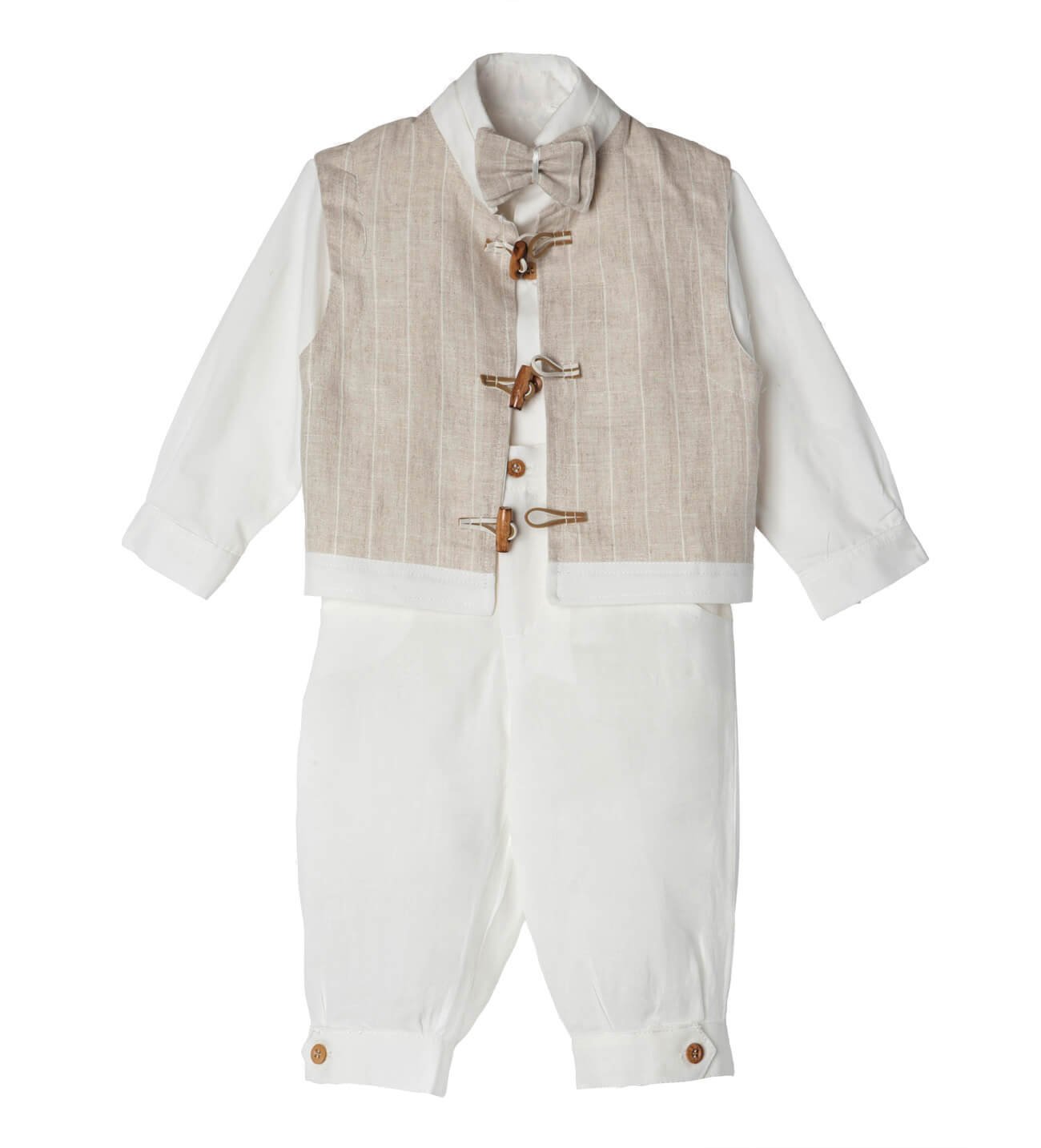 Βαπτιστικά ρούχα, ελληνικής ραφής, υψηλής ποιότητας. Παράγονται στον επαγγελματικό μας χώρο κατά παραγγελία στα μέτρα του παιδιού. Βαπτιστικό ρούχο με ριγέ γιλέκο της άμμου, λευκό πουκάμισο, διπλό παπιόν, παντελόνι γκολφ λευκό.