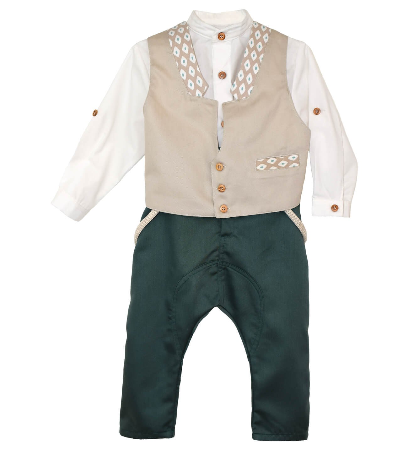 Βαπτιστικά ρούχα, ελληνικής ραφής, υψηλής ποιότητας. Παράγονται στον επαγγελματικό μας χώρο κατά παραγγελία στα μέτρα του παιδιού. Βαπτιστικό ρούχο με πουκάμισο κλασικό βαμβακερό εκρού με ξύλινα κουμπιά, γιλέκο καπαρντίνα με γιακά μάτι, παντελόνι βράκα καπαρτίνα πράσινη και τιράντα κορδόνι μπέζ.