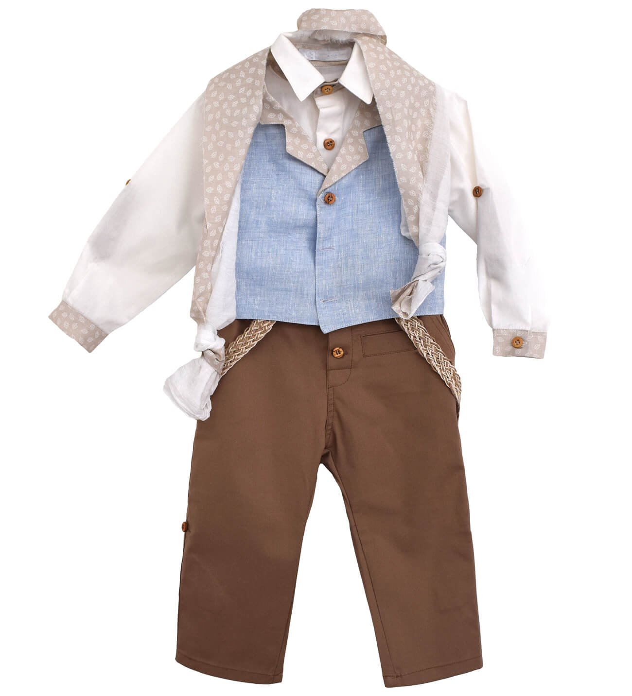 Βαπτιστικά ρούχα, ελληνικής ραφής, υψηλής ποιότητας. Παράγονται στον επαγγελματικό μας χώρο κατά παραγγελία στα μέτρα του παιδιού. Βαπτιστικό ρούχο με πουκάμισο μάο βαμβακερό εκρού με ξύλινα κουμπιά, γιλέκο λινό γαλάζιο με πετάκι μπεζ εκρού φύλλα, παντελόνι κλασικό καπαρντίνα καφέ, τιράντες κοτσίδα μπεζ-εκρού, φουλάρι διπλό γάζα εκρού και μπεζ με εκρού φυλλαράκια.