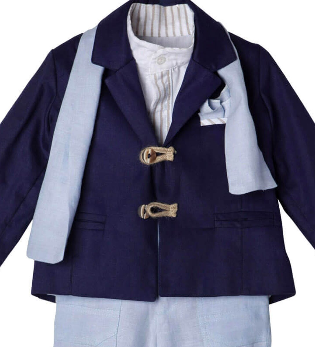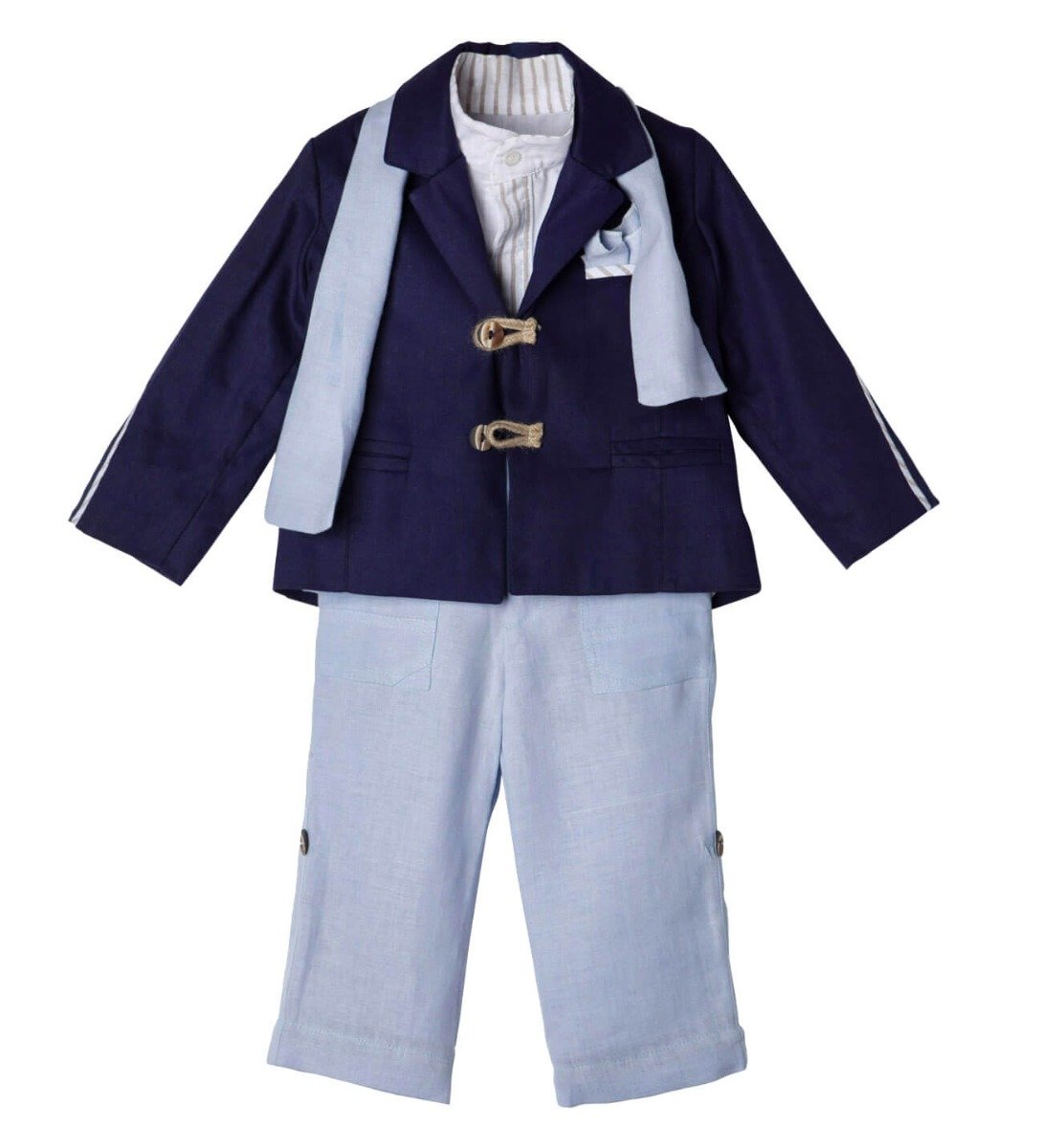 Βαπτιστικά ρούχα, ελληνικής ραφής, υψηλής ποιότητας. Παράγονται στον επαγγελματικό μας χώρο κατά παραγγελία στα μέτρα του παιδιού. Βαπτιστικό ρούχο με σακάκι με ρίγες στο μανίκι, πουκάμισο με λεπτομέρειες ριγέ, σιέλ παντελόνι και ζώνη.