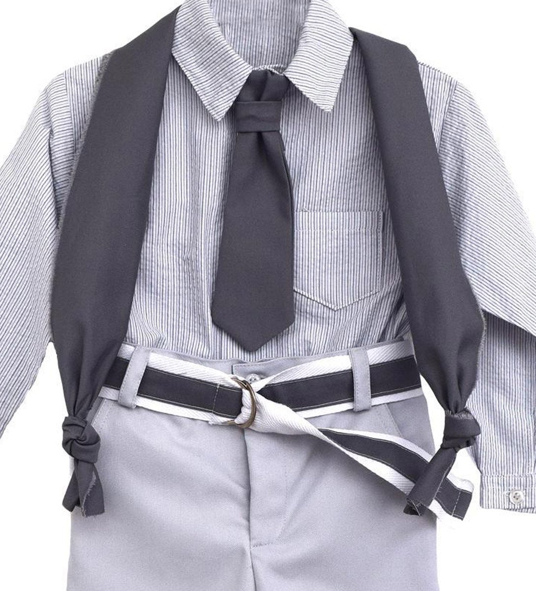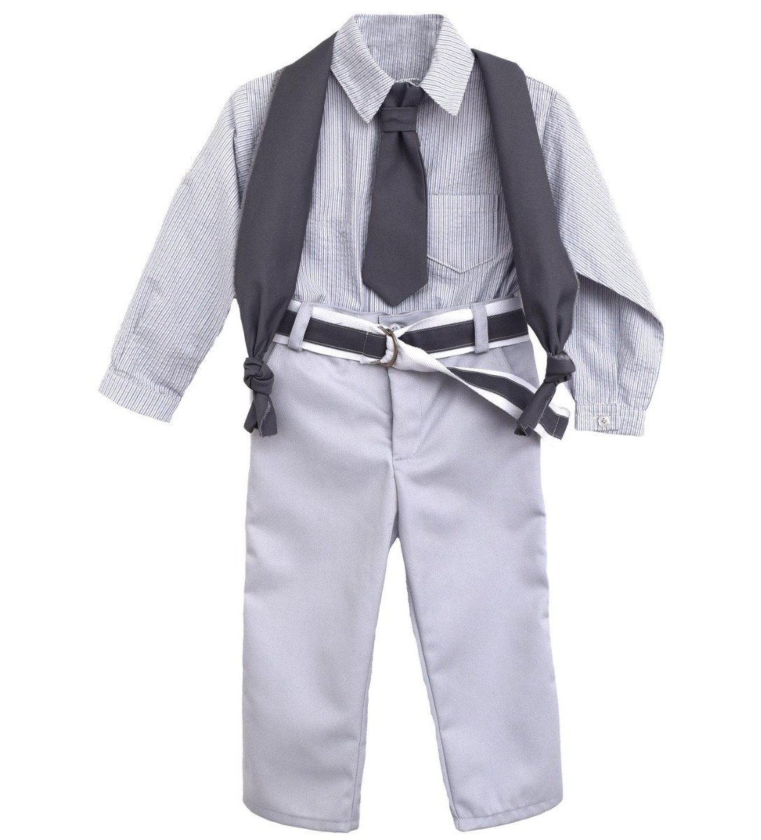 Βαπτιστικά ρούχα, ελληνικής ραφής, υψηλής ποιότητας. Παράγονται στον επαγγελματικό μας χώρο κατά παραγγελία στα μέτρα του παιδιού. Βαπτιστικό ρούχο με πουκάμισο ριγέ βαμβακερό γκρι, παντελόνι κλασικό καπαρντίνα ανοιχτό γκρι, ζώνη λευκή φακαρόλα με λεπτομέρεια από γκρι καπαρτίνα, φουλάρι και γραβατα γκρι καπαρτίνα.