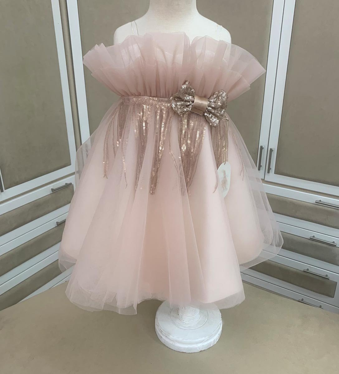 Βαπτιστικό φόρεμα από σάπιο μήλο τούλι, φιόγκος από χρυσές πούλιες και κρόσια από χρυσές πούλιες. Βαπτιστικά ρούχα, ελληνικής ραφής, υψηλής ποιότητας. Παράγονται στον επαγγελματικό μας χώρο κατά παραγγελία στα μέτρα του παιδιού.
