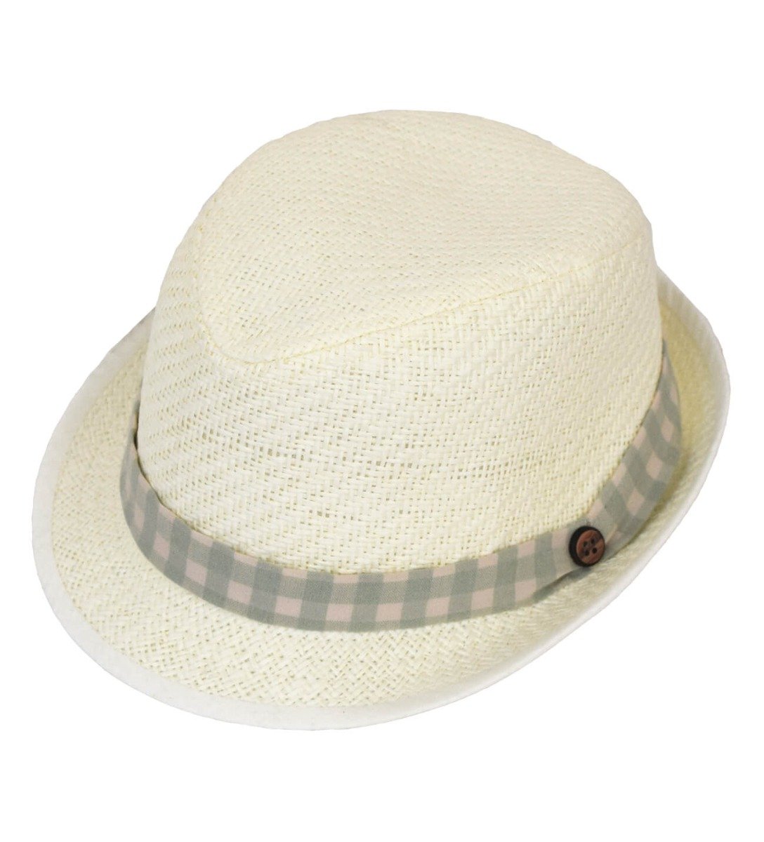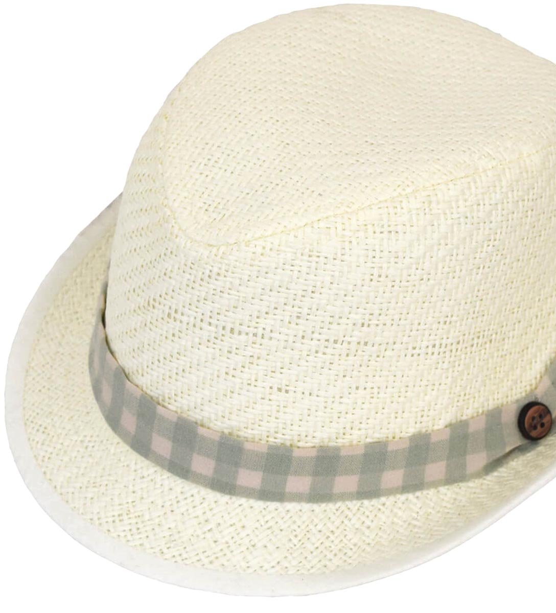 Ψάθινο καπέλο βάπτισης σε εκρού απόχρωση, διακοσμημένο με καρό κορδέλα και ξύλινο κουμπί , ελληνικής παραγωγής.