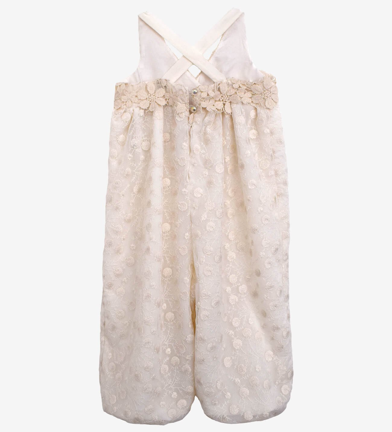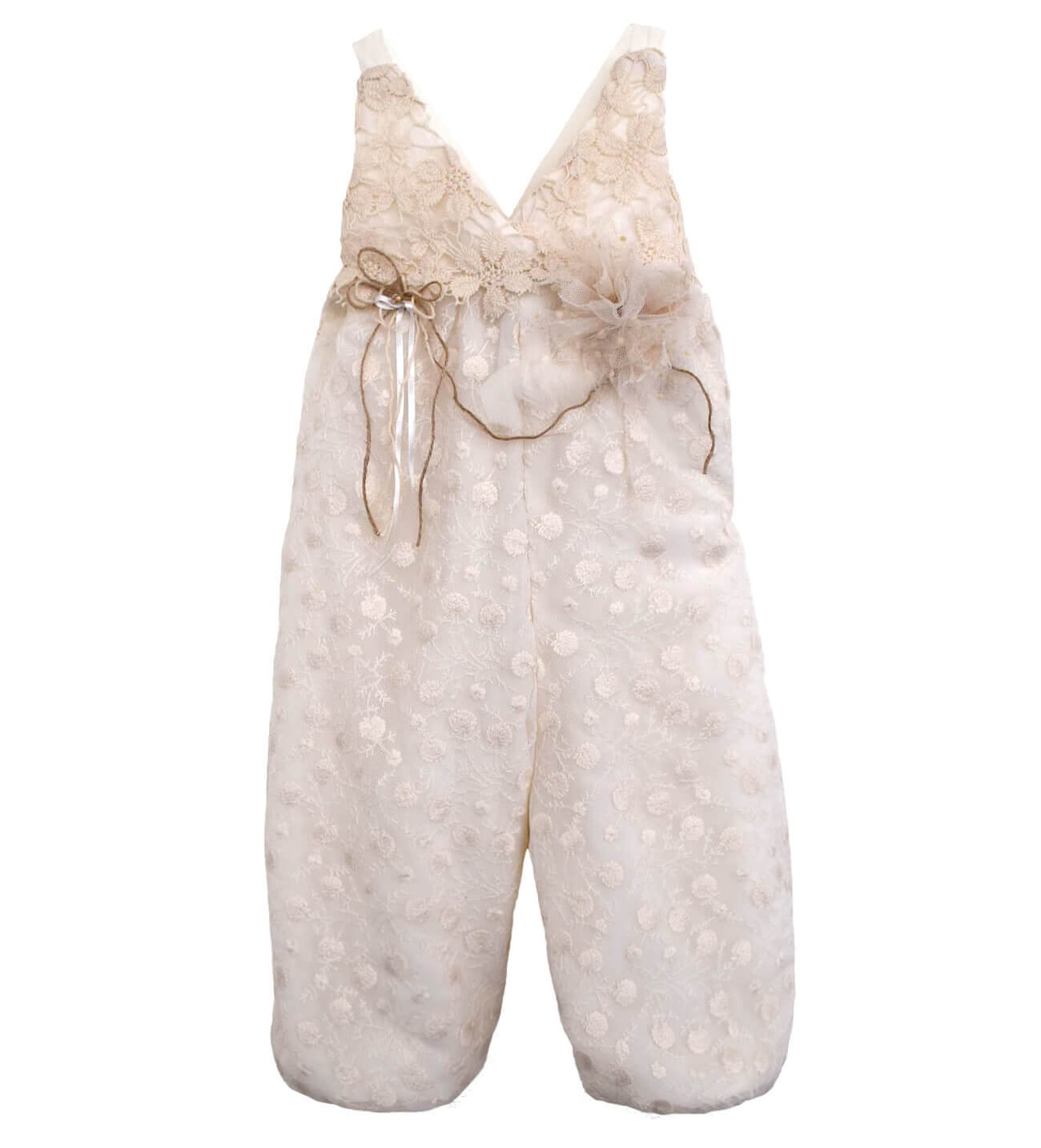 Βαπτιστικό ρούχο, σαλβάρι κρουαζέ αμπίρ με μπούστο δαντέλα μπεζ λουλούδι, και παντελόνι τούλι πουά (σαν λουλούδι) μπεζ, με χειροποίητο τούλινο λουλούδι στη μέση με φτερό και κορδόνια εκρού μπεζ. Βαπτιστικά ρούχα, ελληνικής ραφής, υψηλής ποιότητας. Παράγονται στον επαγγελματικό μας χώρο κατά παραγγελία στα μέτρα του παιδιού.