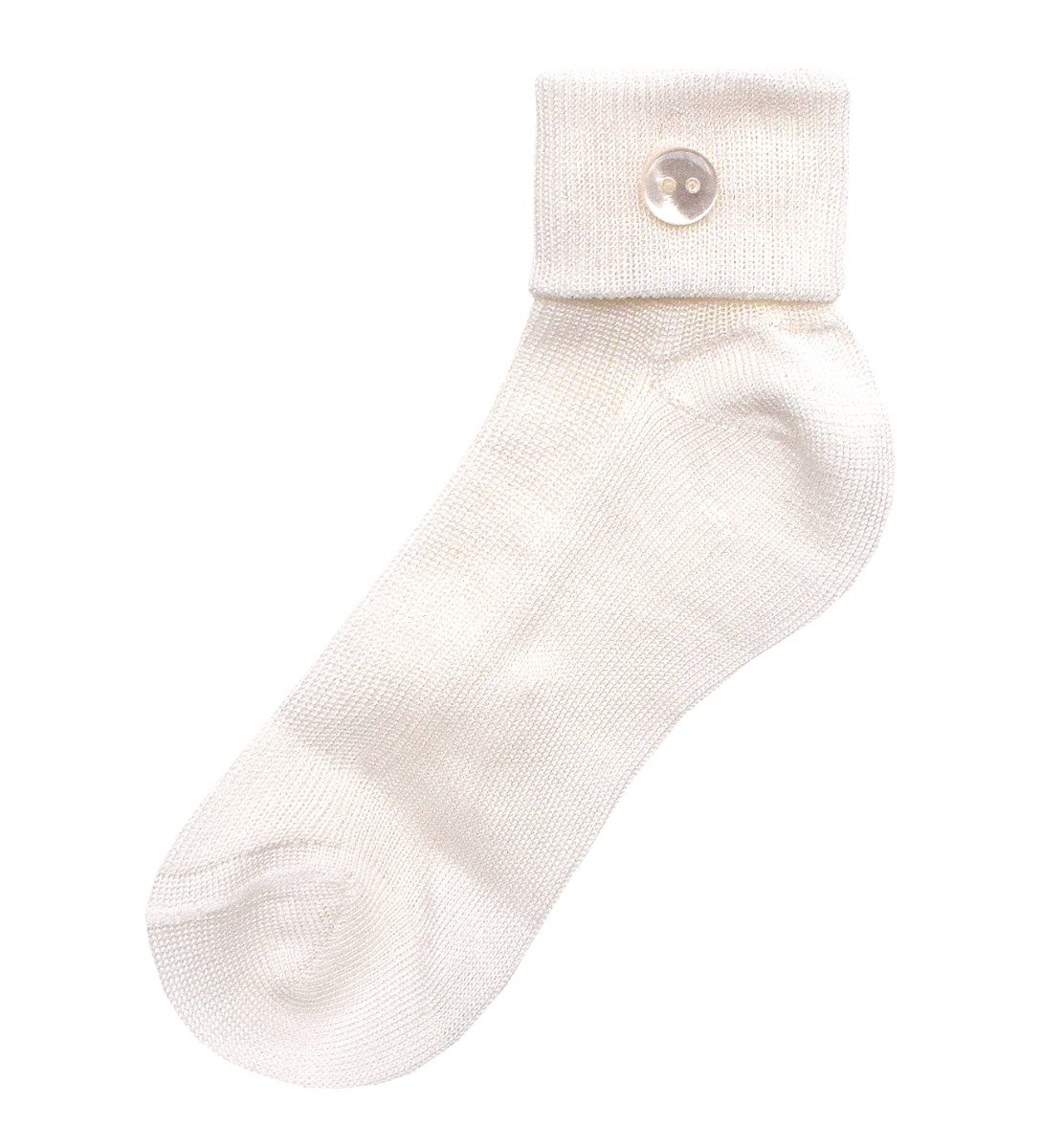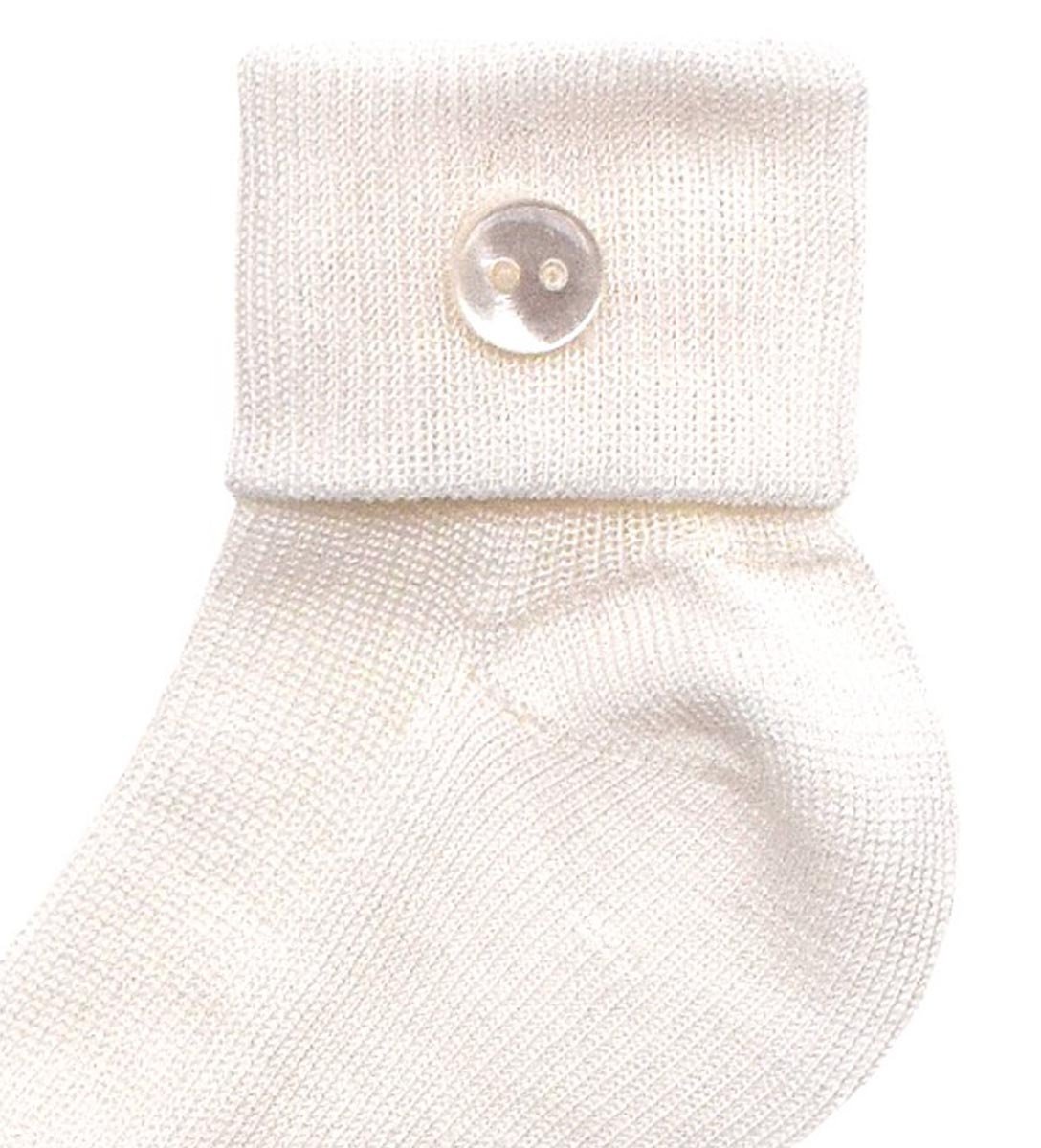 Βαπτιστικά καλτσάκια εκρού, στολισμένα με κουμπί, υποαλλεργικά. Ελληνικής παραγωγής. Μαζεύουν το λάδι από το ποδαράκι του παιδιού όταν βαπτίζεται και βοηθούν στην σωστή εφαρμογή του παπουτσιού της βάπτισης. 100% Βαμβάκι Χρονών 0 – 2