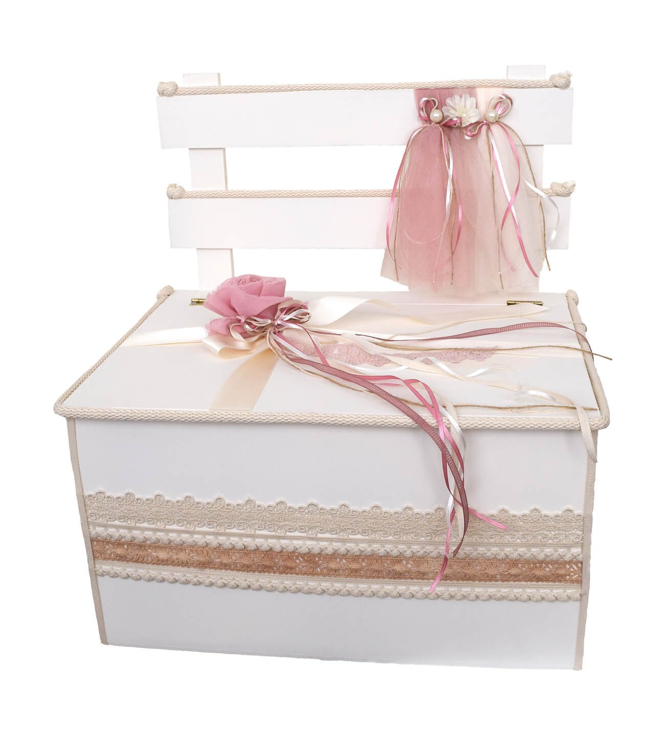 Ξύλινο παγκάκι βάπτισης διακοσμημένο από μπεζ σχοινάκια, πλεκτές τρέσες, τούλια και χειροποιητα λουλούδια. Ελληνικής κατασκευής. Με διαστάσεις 51x34x45 ώστε να χωράει τα ολοκληρωμένα βαπτιστικά πακέτα. Χρησιμοποιείται αργότερα για κουτί παιχνιδιών ή αποθηκευτικό χώρο.