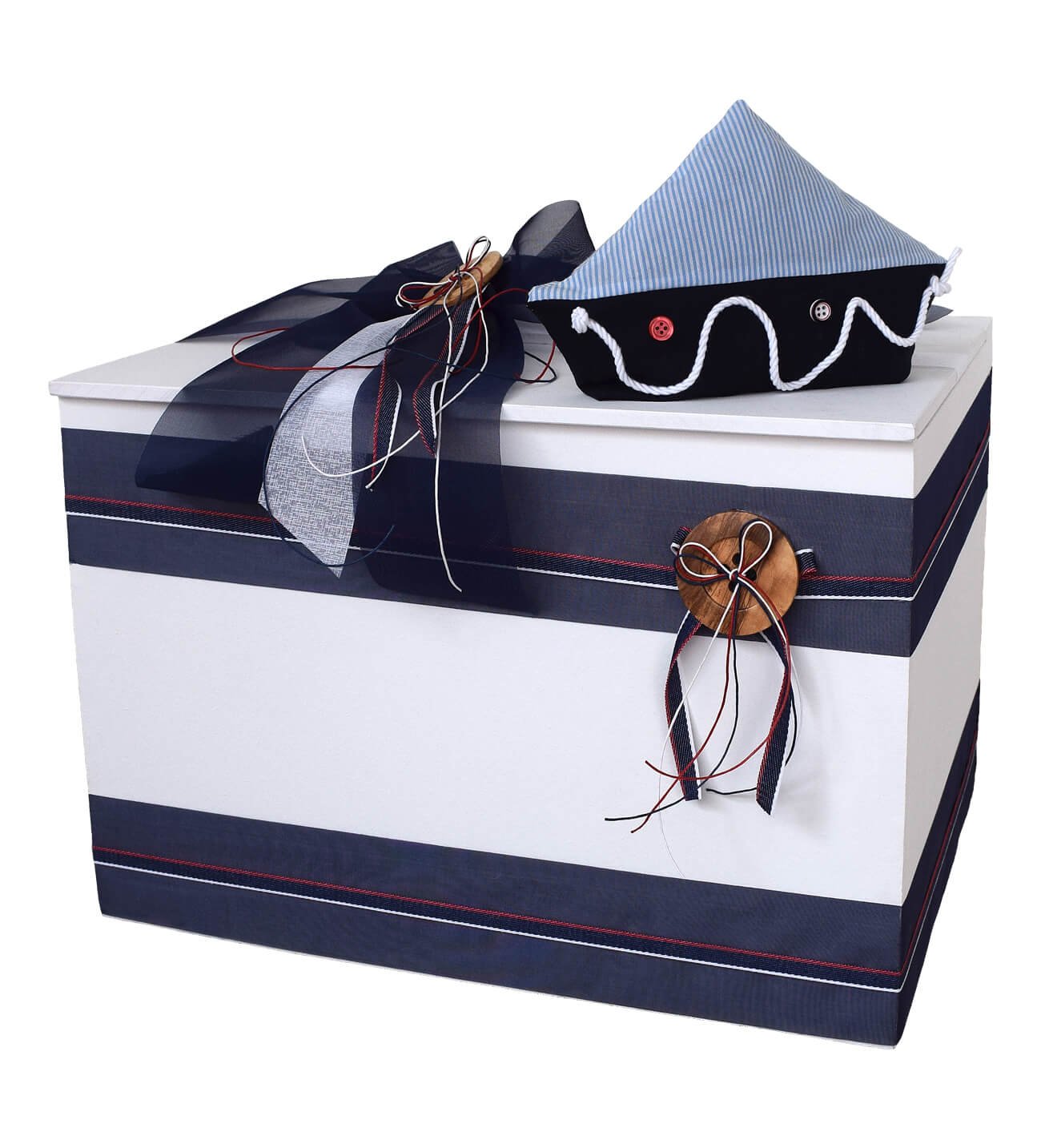 Ξύλινο κουτί βάπτισης σε εκρού χρώμα, διακοσμημένο με μπλε κορδέλες, ξύλινο κουμπί, χειροποίητο καραβάκι και κόκκινες λεπτομέρειες, ελληνικής κατασκευής. Με διαστάσεις 46x34x32 ώστε να χωράει τα ολοκληρωμένα βαπτιστικά πακέτα. Χρησιμοποιείται αργότερα για κουτί παιχνιδιών ή αποθηκευτικό χώρο.