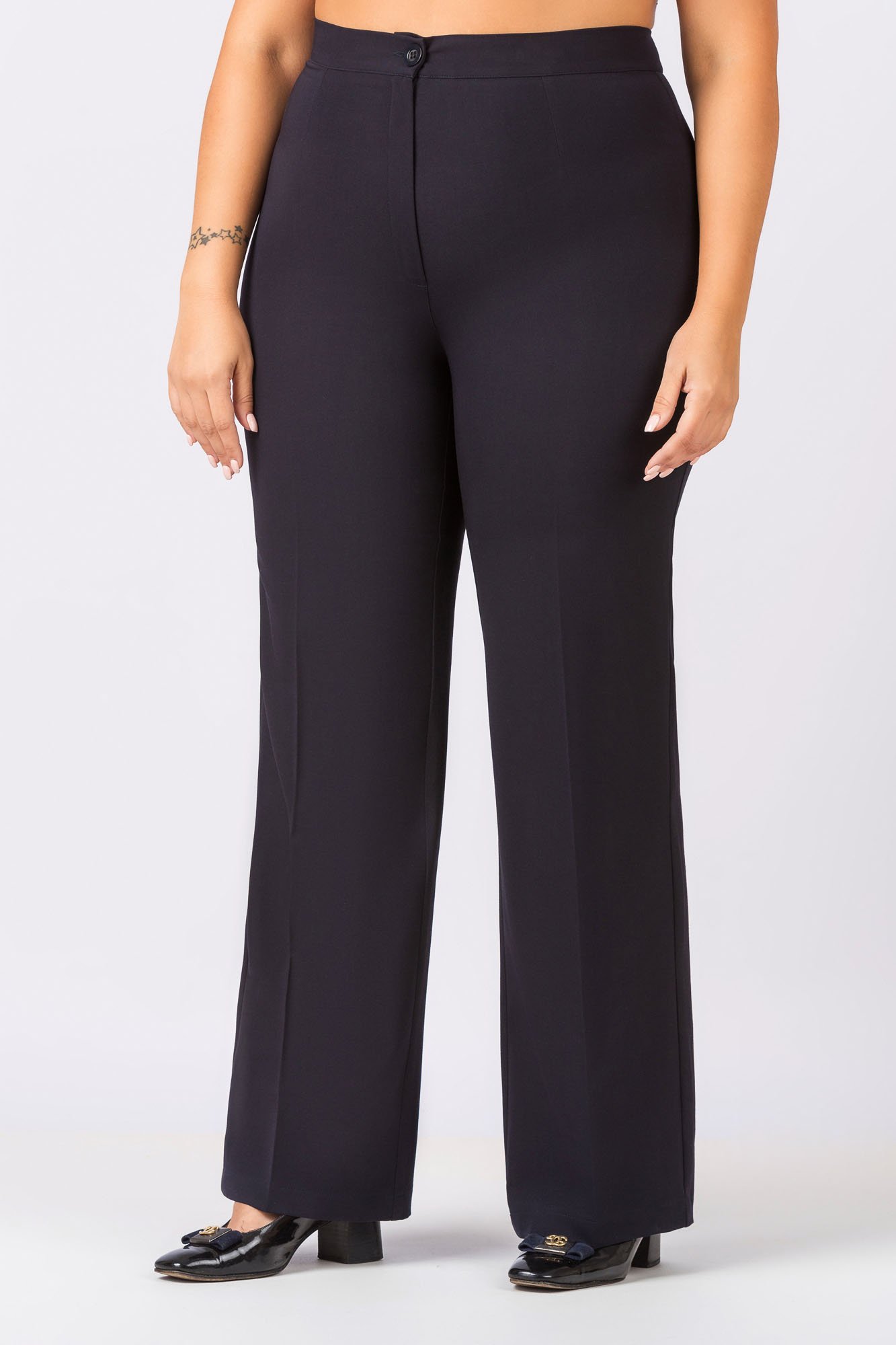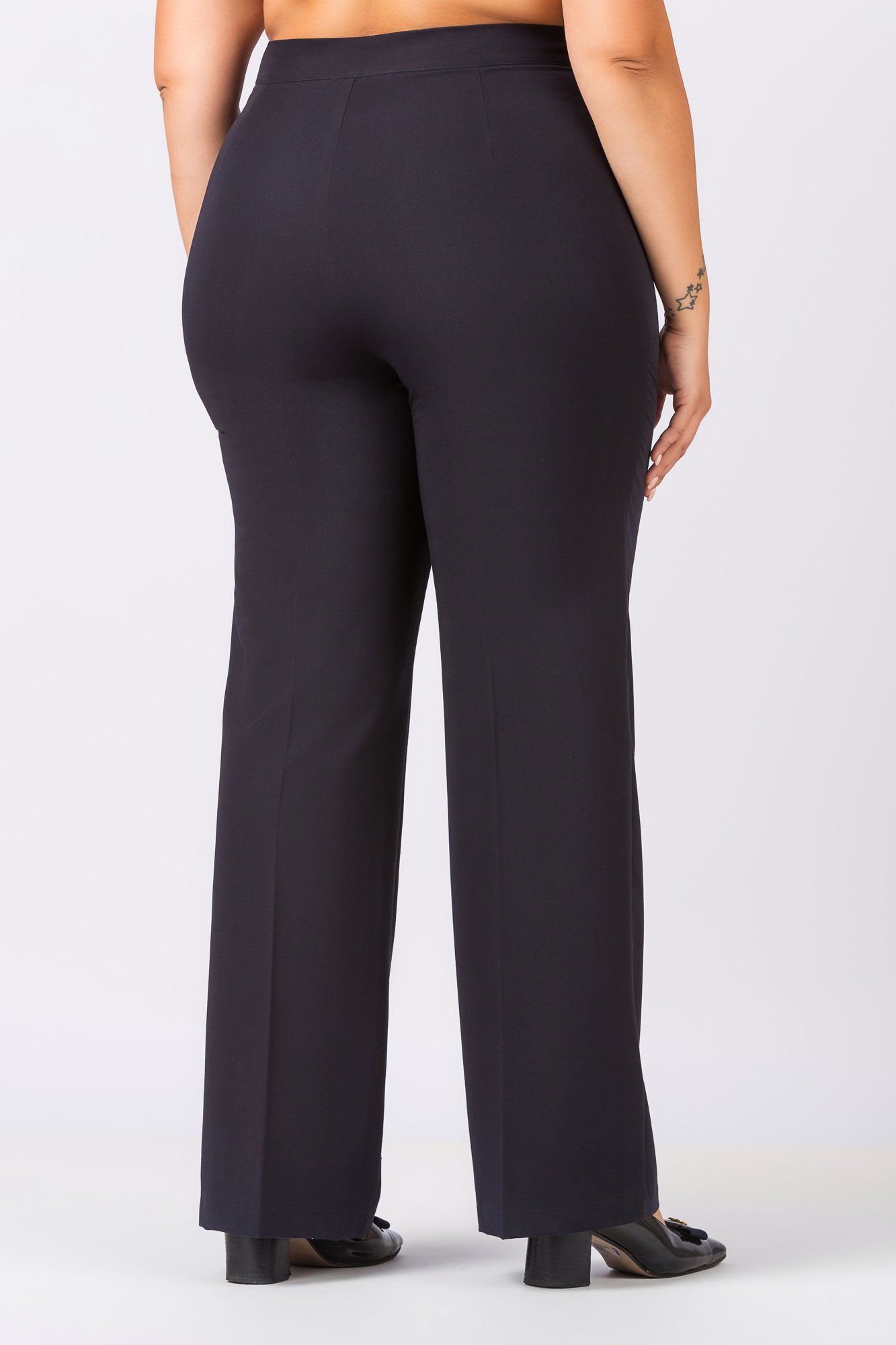 Ελαστικό παντελόνι σε κομψή γραμμή. Κλείνει με κουμπί και φερμουάρ. Καμπάνα στο τελείωμα. Ένα κλασσικό παντελόνι που φοριέται σε κάθε περίσταση, από το γραφείο μέχρι τη βραδινή βόλτα. Η Στέλλα έχει ύψος 1,71, στήθος 107εκ, μέση 94εκ και περιφέρεια 124εκ και φοράει large.