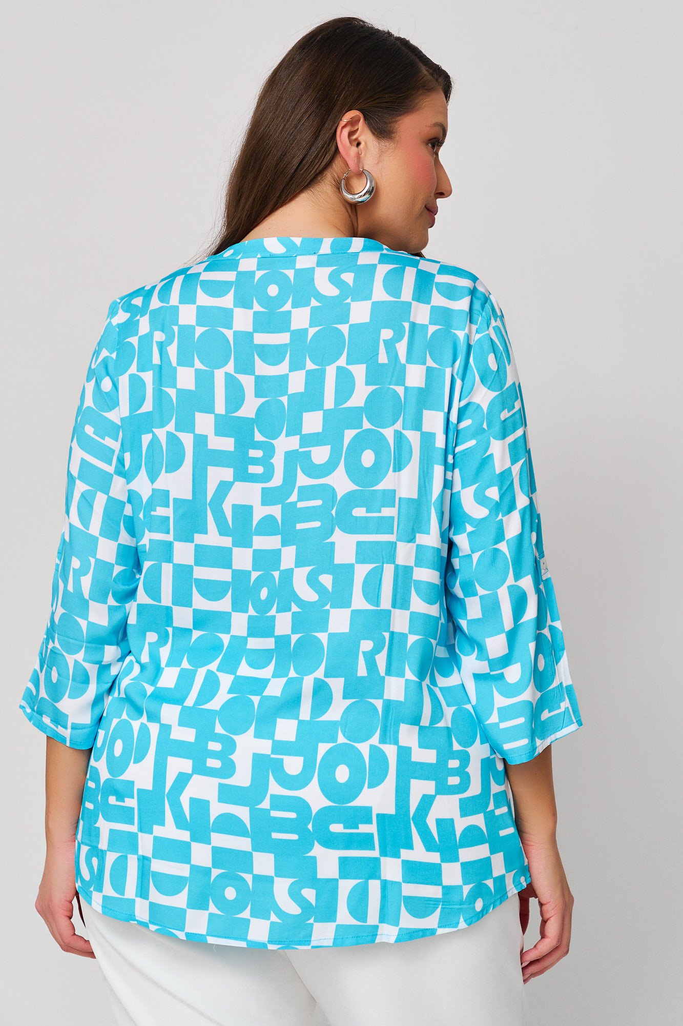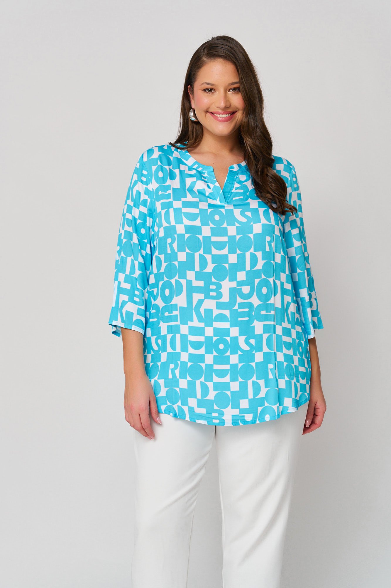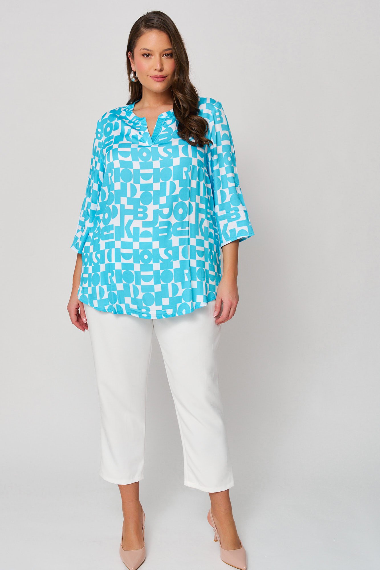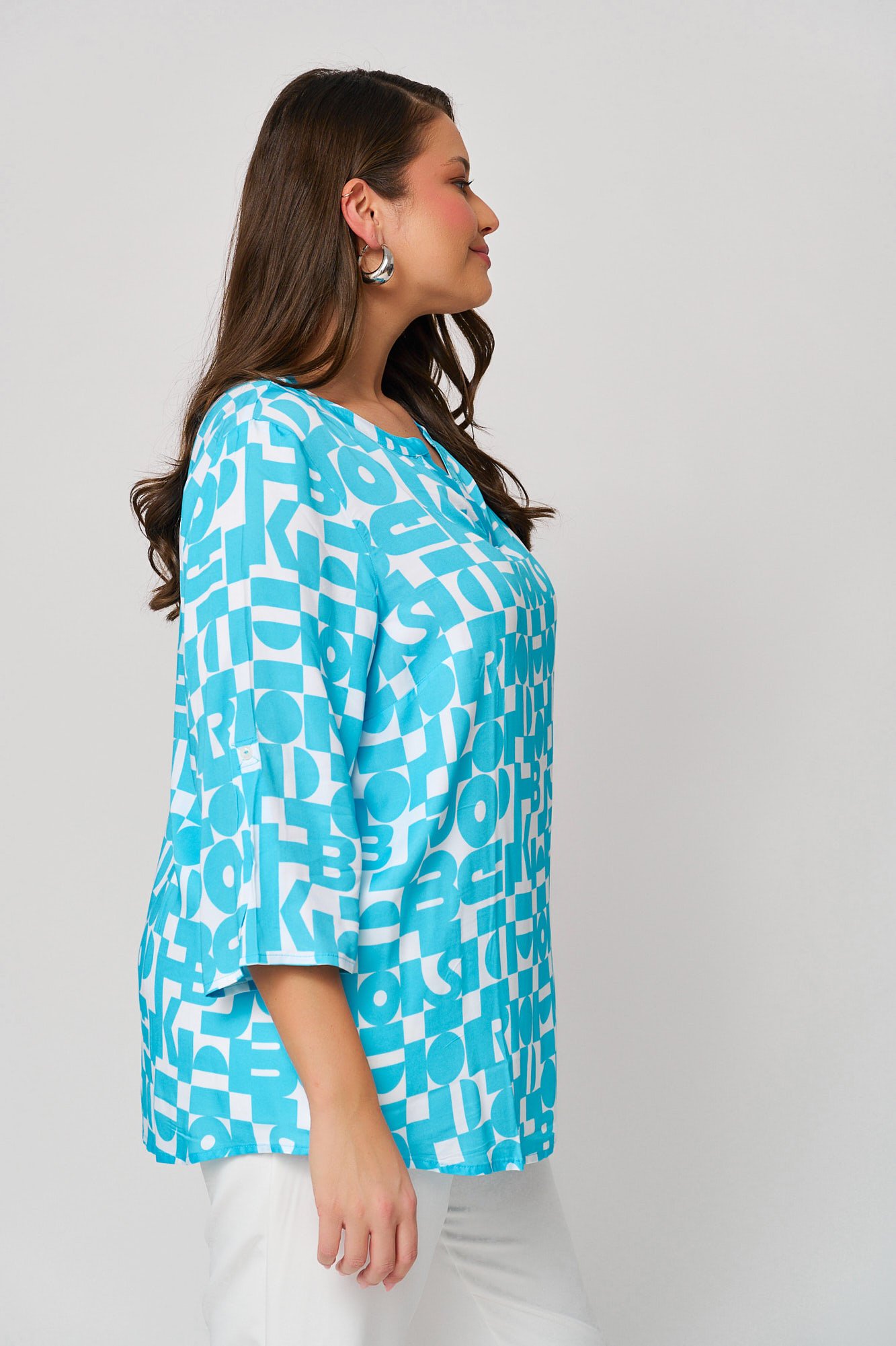 Μπλούζα από βισκόζ σε λευκή βάση με ένα εντυπωσιακό γαλάζιο μοτίβο που αποτελείται από γράμματα και γεωμετρικά σχήματα. Διαθέτει V λαιμόκοψη με ένα μικρό άνοιγμα. 3/4 μανίκια. Το μήκος της είναι 78εκ. Συνδυάζεται εύκολα με τζιν, φούστες ή παντελόνες για κομψό και χαλαρό look. Η Ιβάνα έχει ύψος 180εκ, στήθος 114εκ ,μέση 88εκ και περιφέρεια 121εκ και φοράει xl.