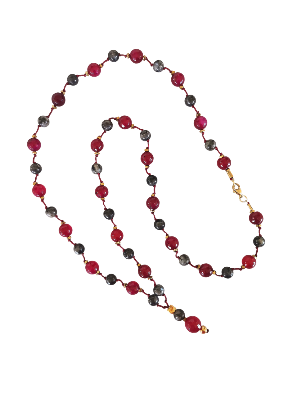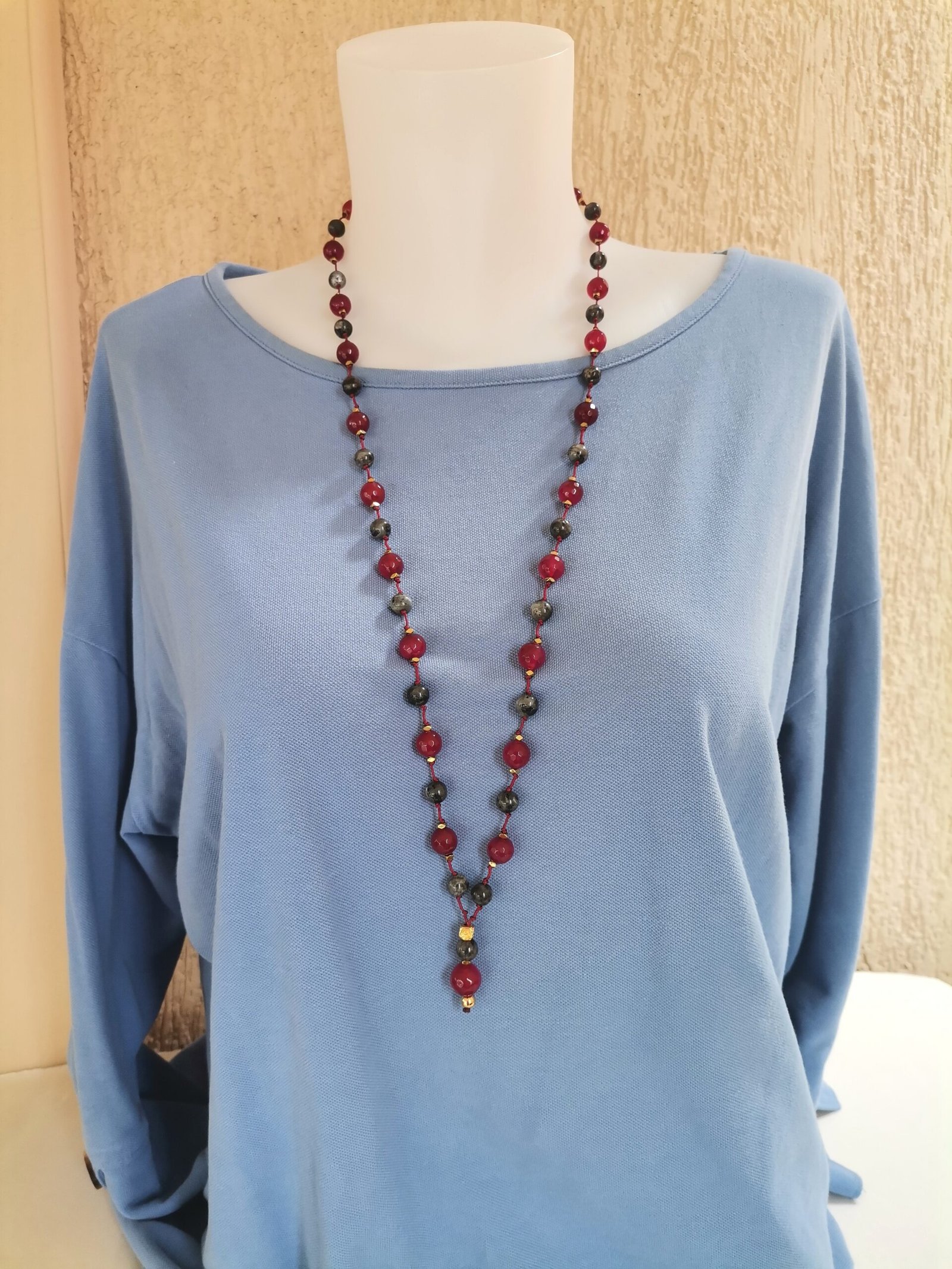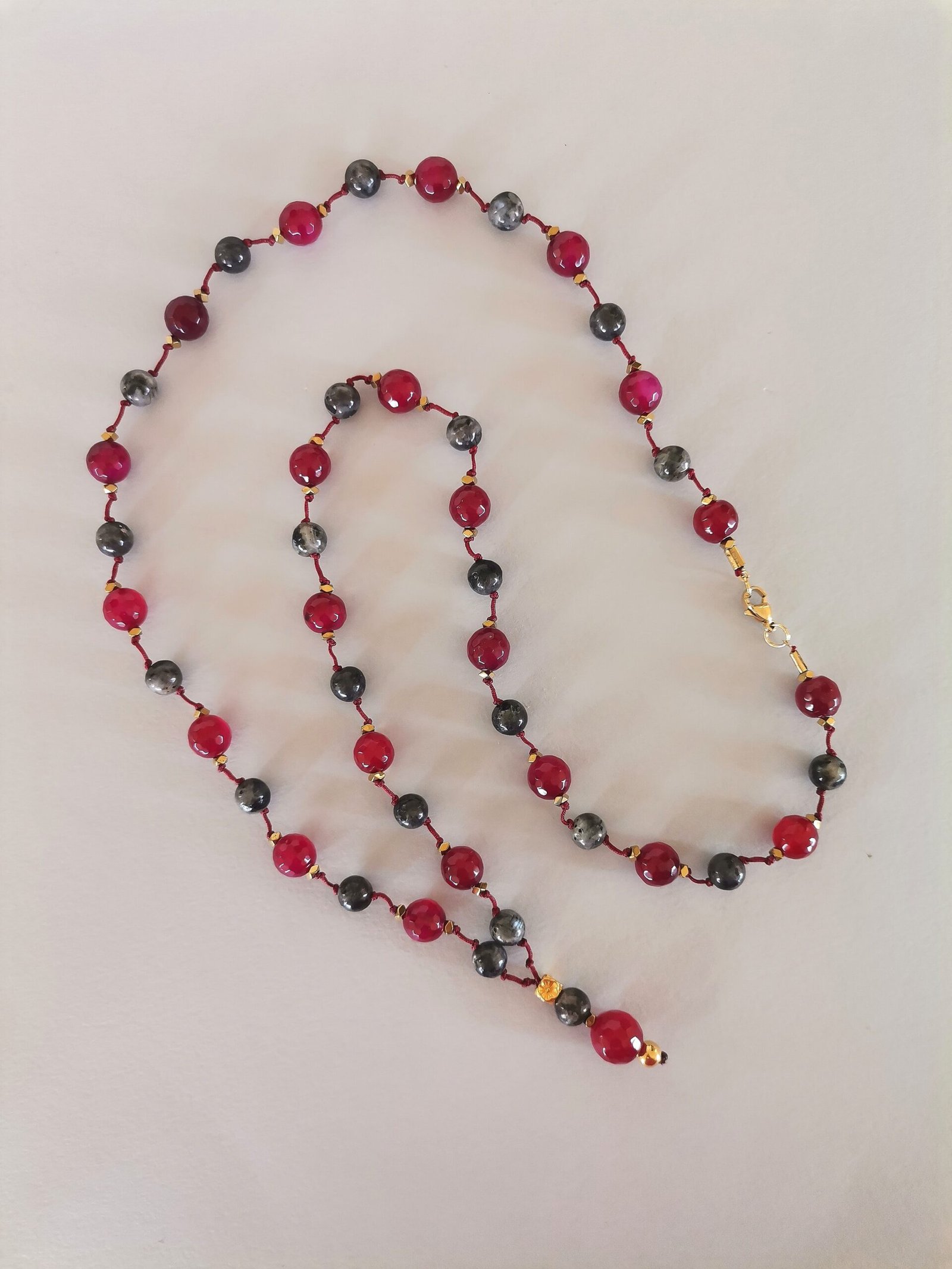 Μακρύ κολιέ ροζάριο με κόκκινο αχάτη ruby ταγιέ 10mm και 12mm, σφαιρικό λαρβικίτη (μαύρο λαμπραντορίτη) 8mm, χρυσαφί αιματίτες ταγιέ, επίχρυση χάντρα από zamak σε κυβικό σχήμα και ατσάλινη σφαιρική χάντρα. Είναι δεμένο σε ίσες αποστάσεις με μπορντώ κορδόνι και έχει ατσάλινο κούμπωμα και ατσάλινους ακροδέκτες.