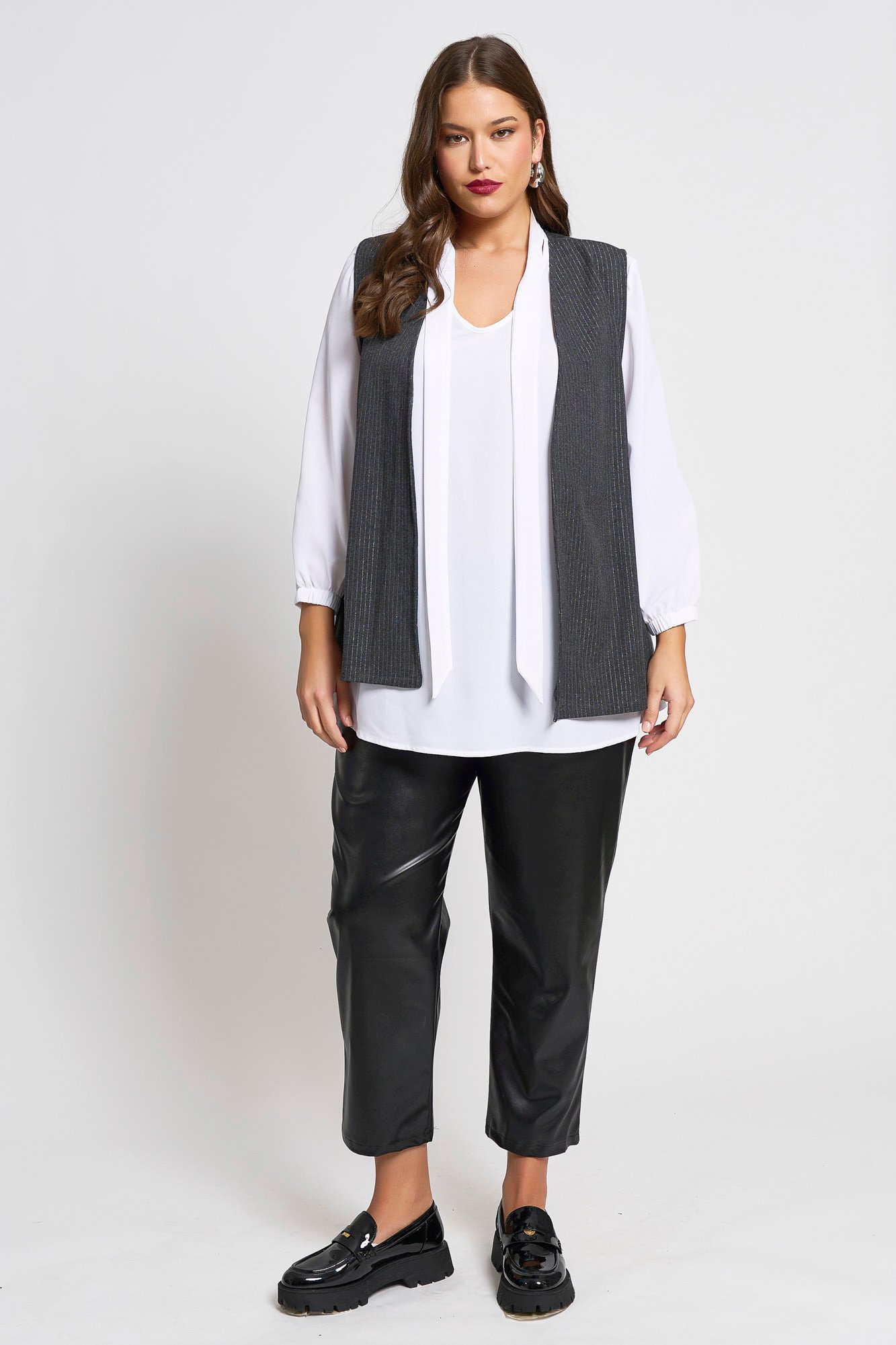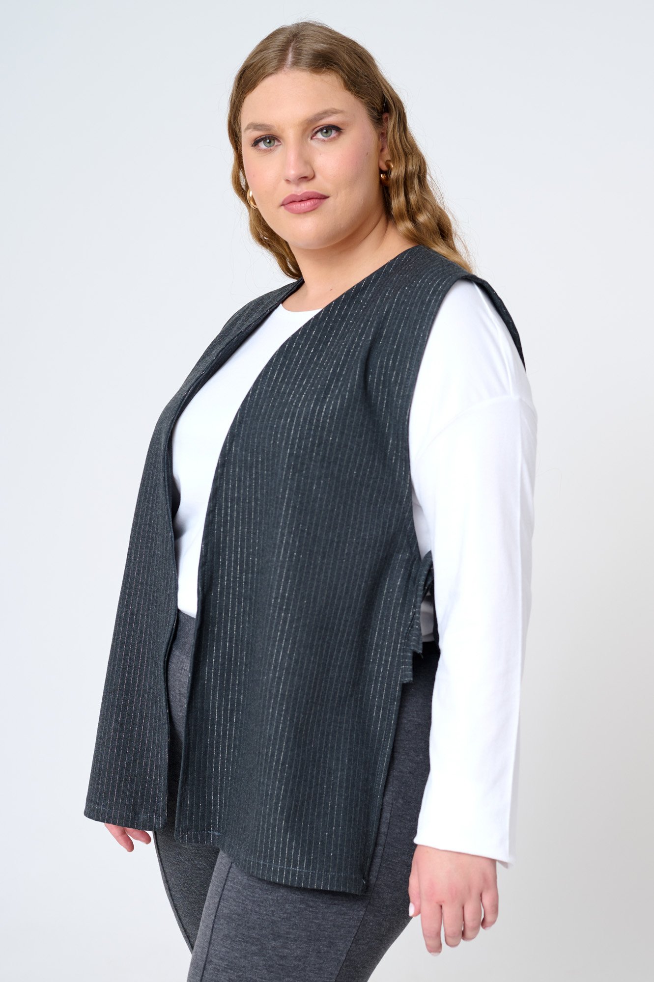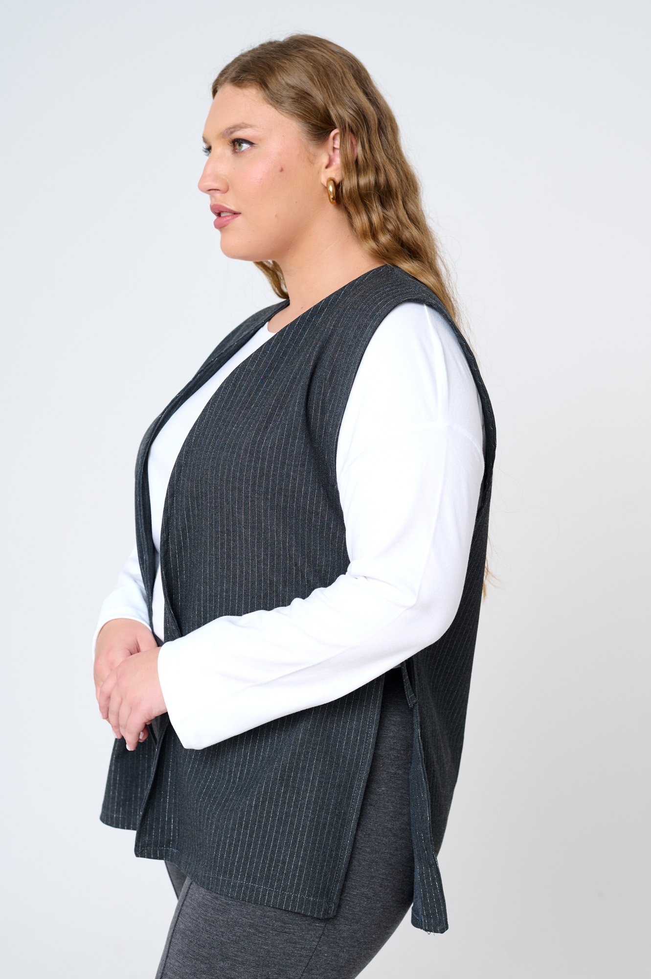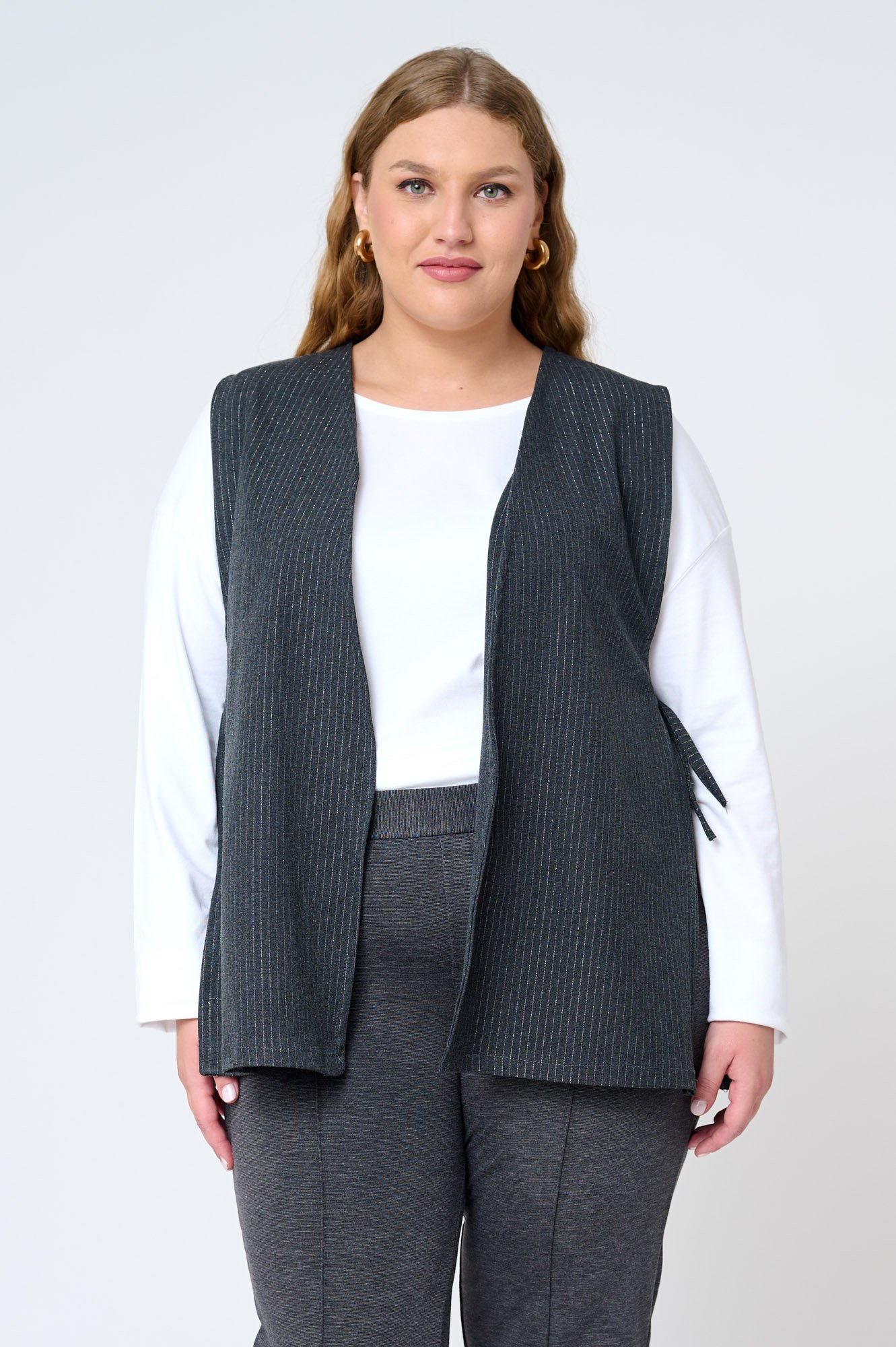 Αμάνικο γιλέκο σε ριγέ γκρι-άσπρο. Ανοίγματα στο πλάι που κλείνουν με κορδόνια ίδιας ύφανσης. Ιδανική επιλογή για τις ενδιάμεσες εποχές. Οne size που καλύπτει άνετα 140εκ. Η Θεοδώρα έχει ύψος 1,70, στήθος 113εκ, περιφέρεια 125εκ και φοράει xl.