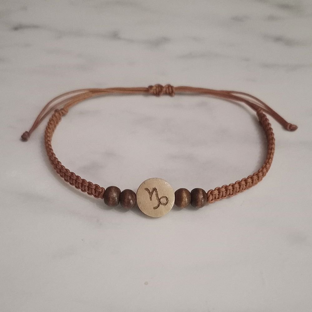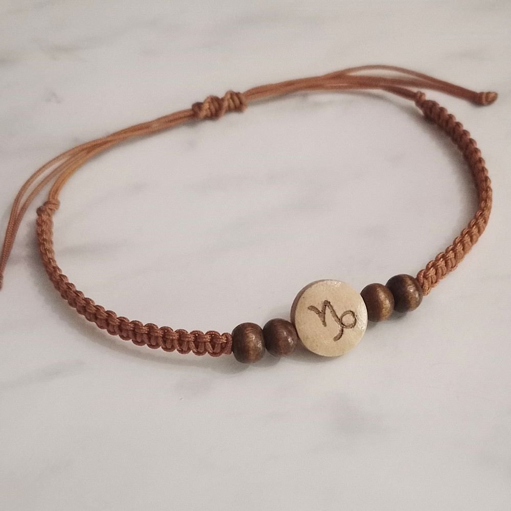 Η κεντρική χάντρα είναι ξύλινη, σε φυσική απόχρωση, με χαραγμένο το σύμβολο του Αιγόκερου και πλαισιώνεται από δύο μικρότερες καφέ ξύλινες χάντρες.