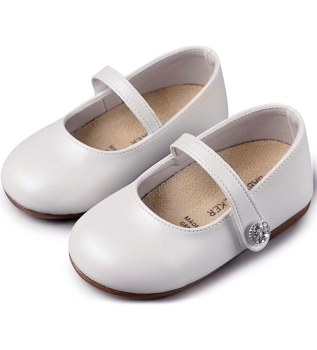 Παπούτσια βαπτιστικά, ανατομικά, γοβάκια με μπαρέτα με στόλισμα στρασένιο κουμπάκι, από δέρμα, σε λευκό χρώμα, BABYWALKER. Ελληνικής παραγωγής. Χρόνος παράδοσης 3 με 6 εργάσιμες. Μετρήστε το πατουσάκι του παιδιού (με τεντωμένα τα δαχτυλάκια του) και πάρτε μας τηλέφωνο να σας πούμε το νούμερο που πρέπει να παραγγείλετε. BS 3502