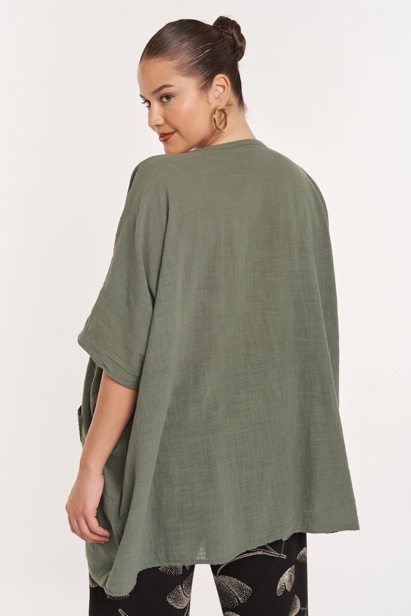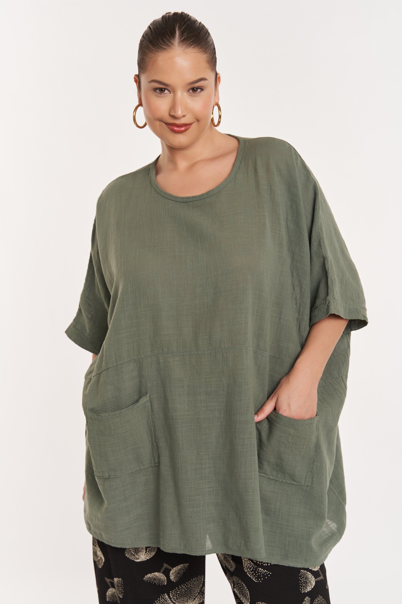 Αέρινη βαμβακερή μπλούζα σε άνετη γραμμή. Στρόγγυλη λαιμόκοψη. Μανίκια στον αγκώνα. Εξωτερικές τσέπες στο ίδιο ύφασμα. Είναι one size και καλύπτει έως 190εκ στήθος και περιφέρεια. Μήκος 86εκ. Δοκιμάστε την με ζώνη ώστε να τονίσετε την μέση σας. Η Ιβάνα έχει ύψος 180εκ, στήθος 114εκ ,μέση 88εκ και περιφέρεια 121εκ.