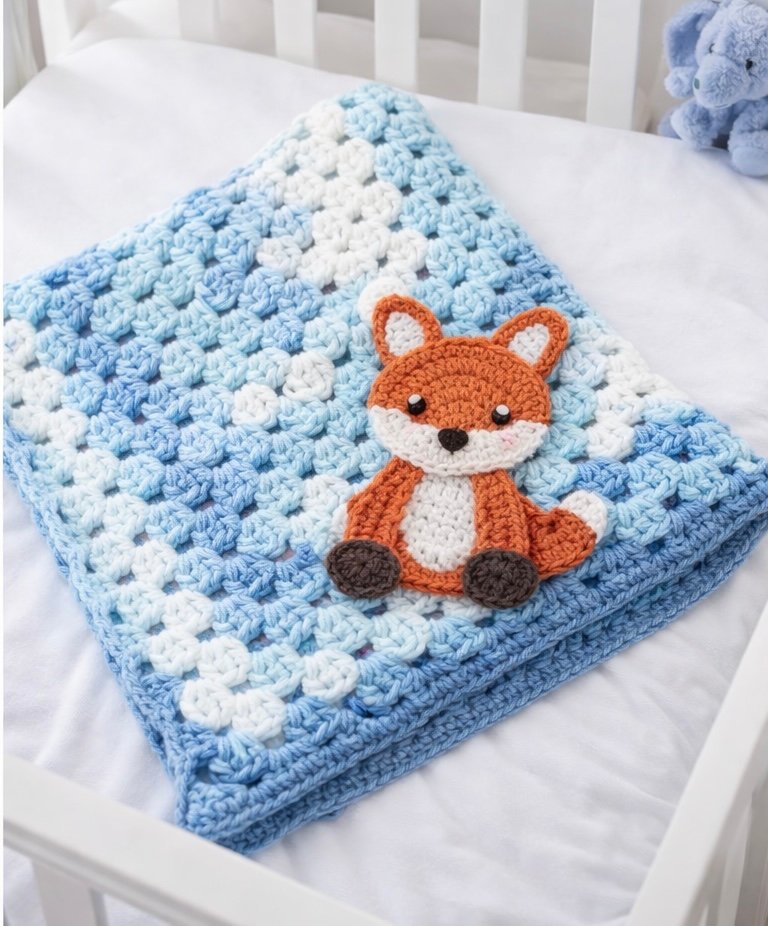 Μια μοναδική, χειροποίητη πλεκτή κουβερτούλα για μωρά, φτιαγμένη με πολλή αγάπη και προσοχή στη λεπτομέρεια. Η κουβερτούλα έχει απαλή υφή και όμορφο πλεκτό μοτίβο τύπου granny, ενώ σε μία γωνία της είναι ραμμένο ένα χαριτωμένο πλεκτό ζωάκι που δίνει παιχνιδιάρικο χαρακτήρα και κάνει την κουβερτούλα ξεχωριστή.