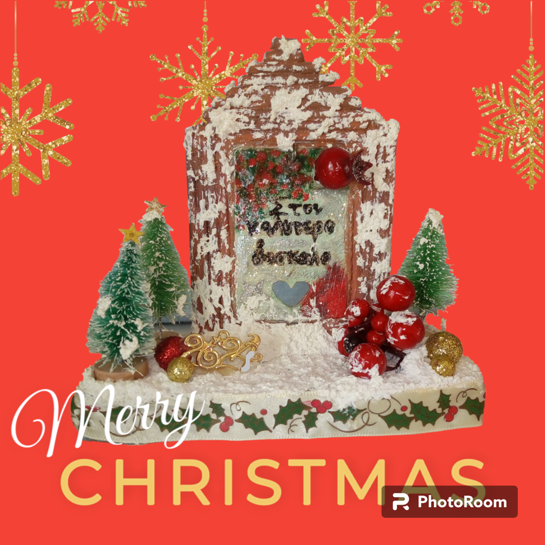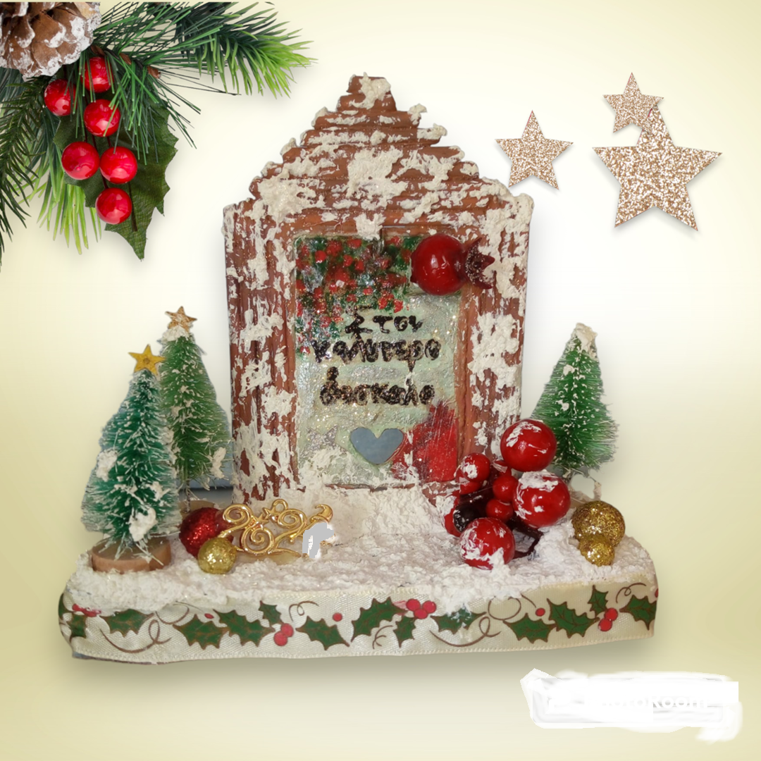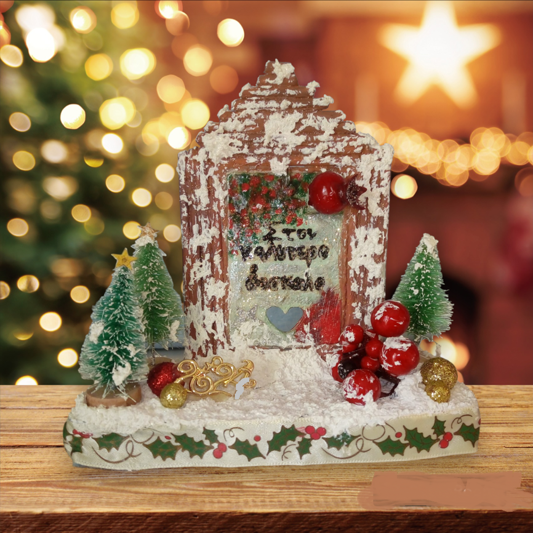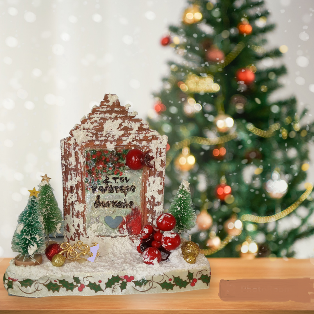 Χειροποιητο Γουρι 2026,,συνθεση με ξυλινο σπιτακι με την χιονισμενη αυλη του, για τον καλυτερο δασκαλο