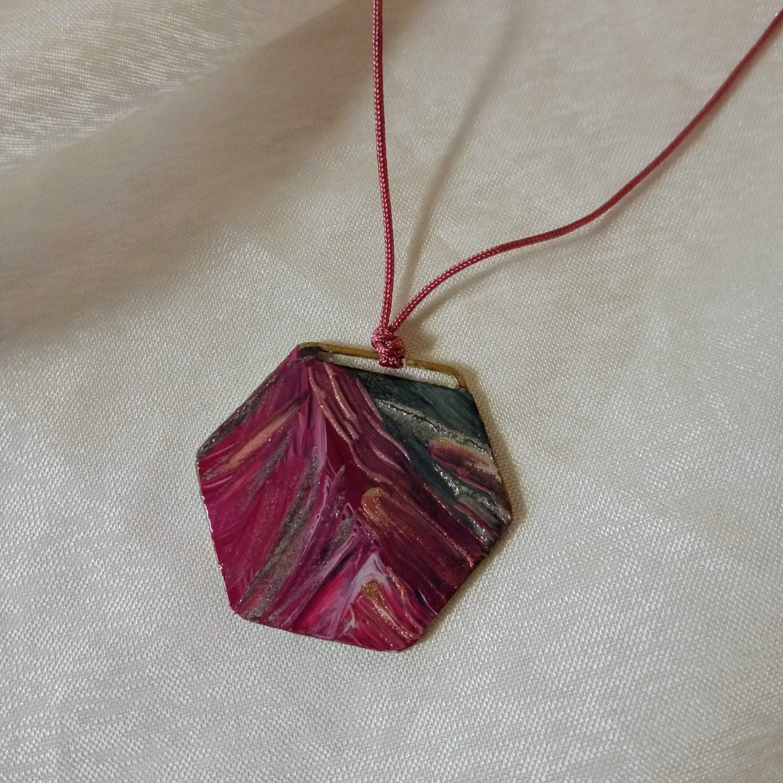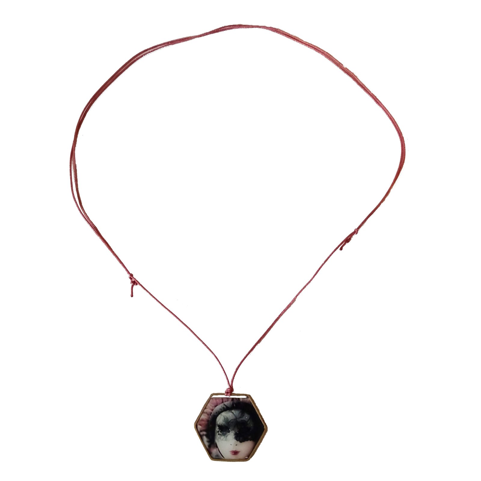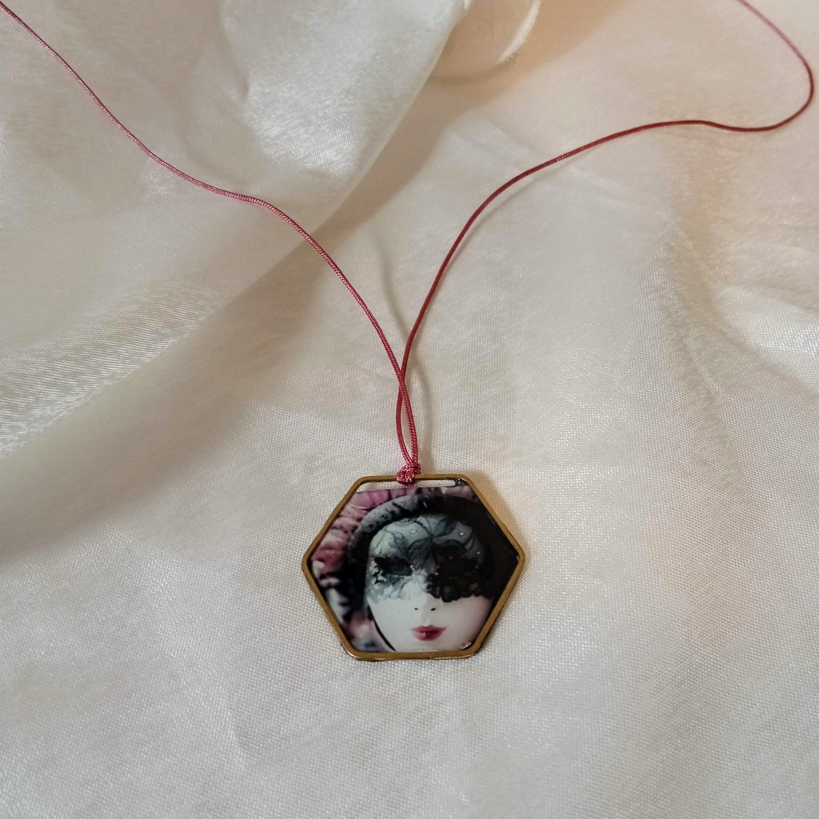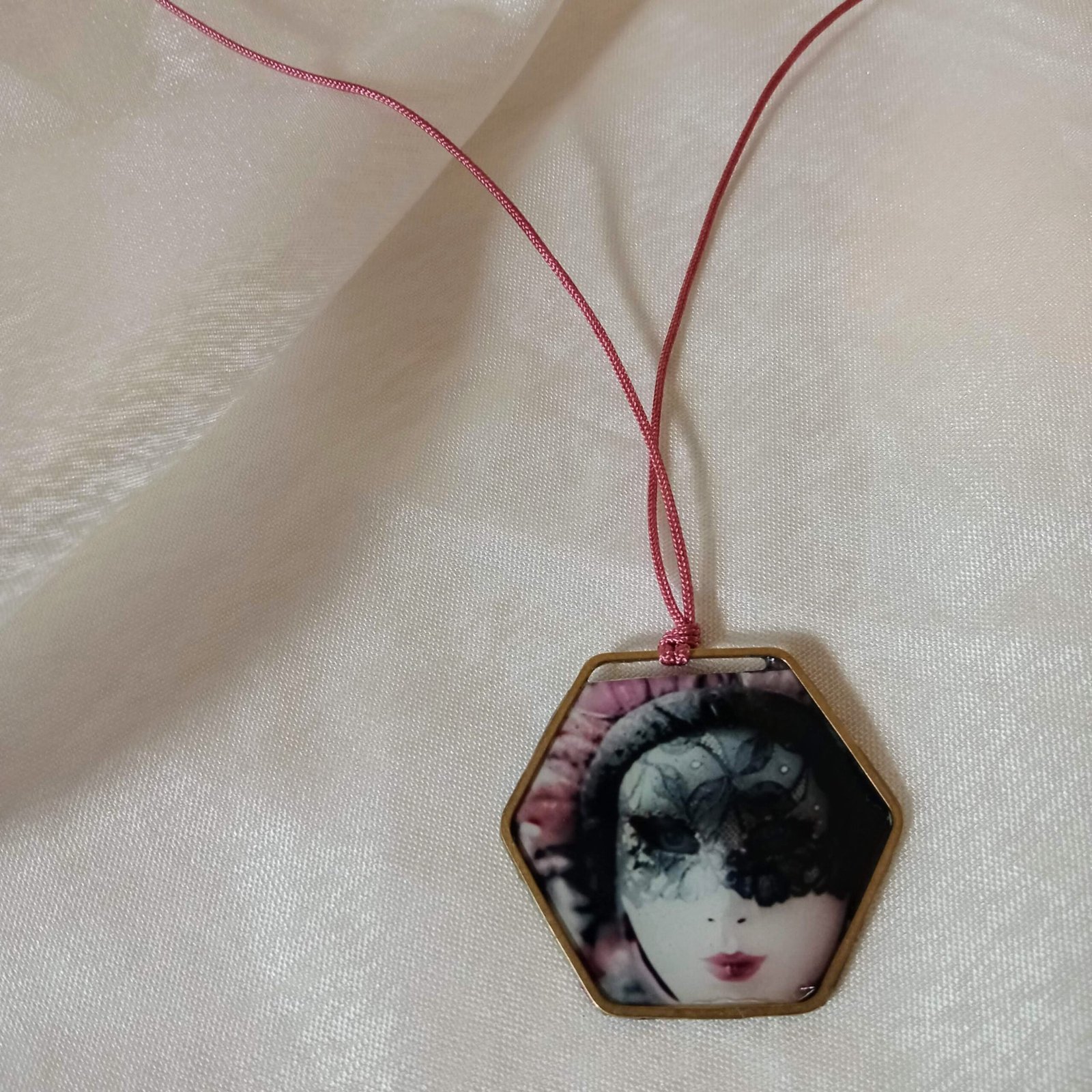 Χειροποίητο κολιέ, αυξομειούμενο, εξάγωνο, μπρούτζινο, δύο όψεων, με επικάλυψη υγρό γυαλιού. Η μια καρναβαλική, με φωτογραφία βενετσιάνικης μάσκας και η άλλη ζωγραφισμένη στο χέρι σε αποχρώσεις ροζ, μωβ, γκρι, ασημί, χρυσαφί. Κρέμεται από αυξομειούμενο κορδόνι σε χρώμα ροζ-σάπιο μήλο. Διαστάσεις: Εξάγωνο 3,5×4εκ, μάκρος 54εκ.. Μοναδικό κομμάτι.
