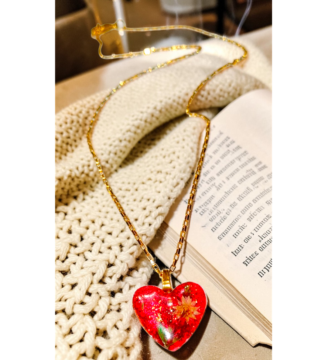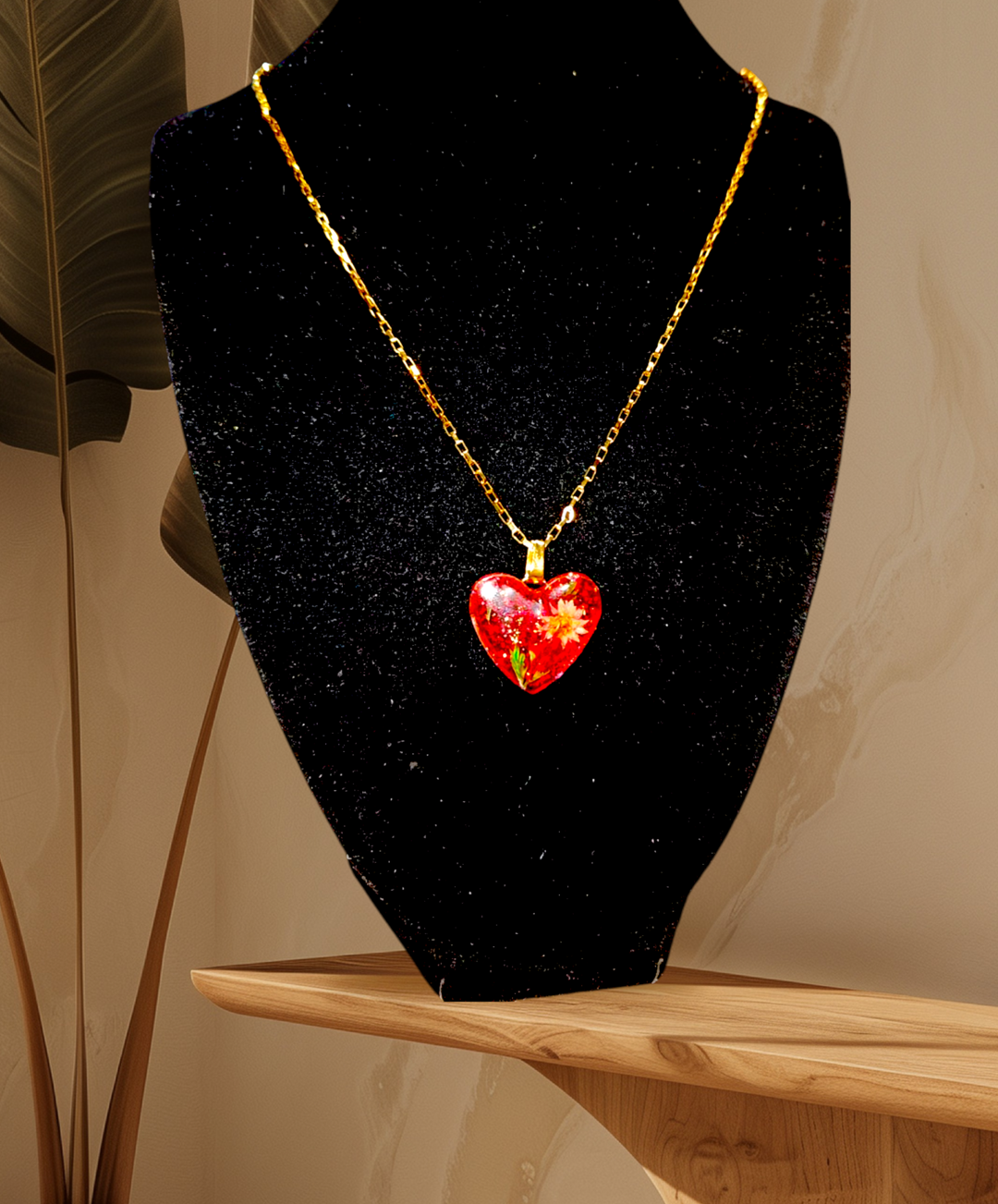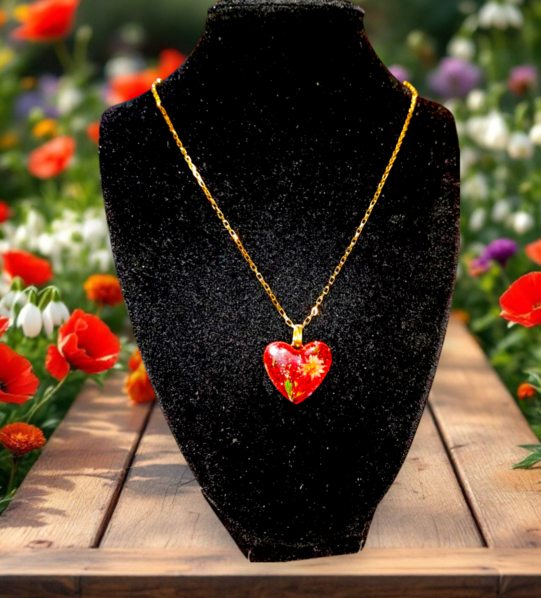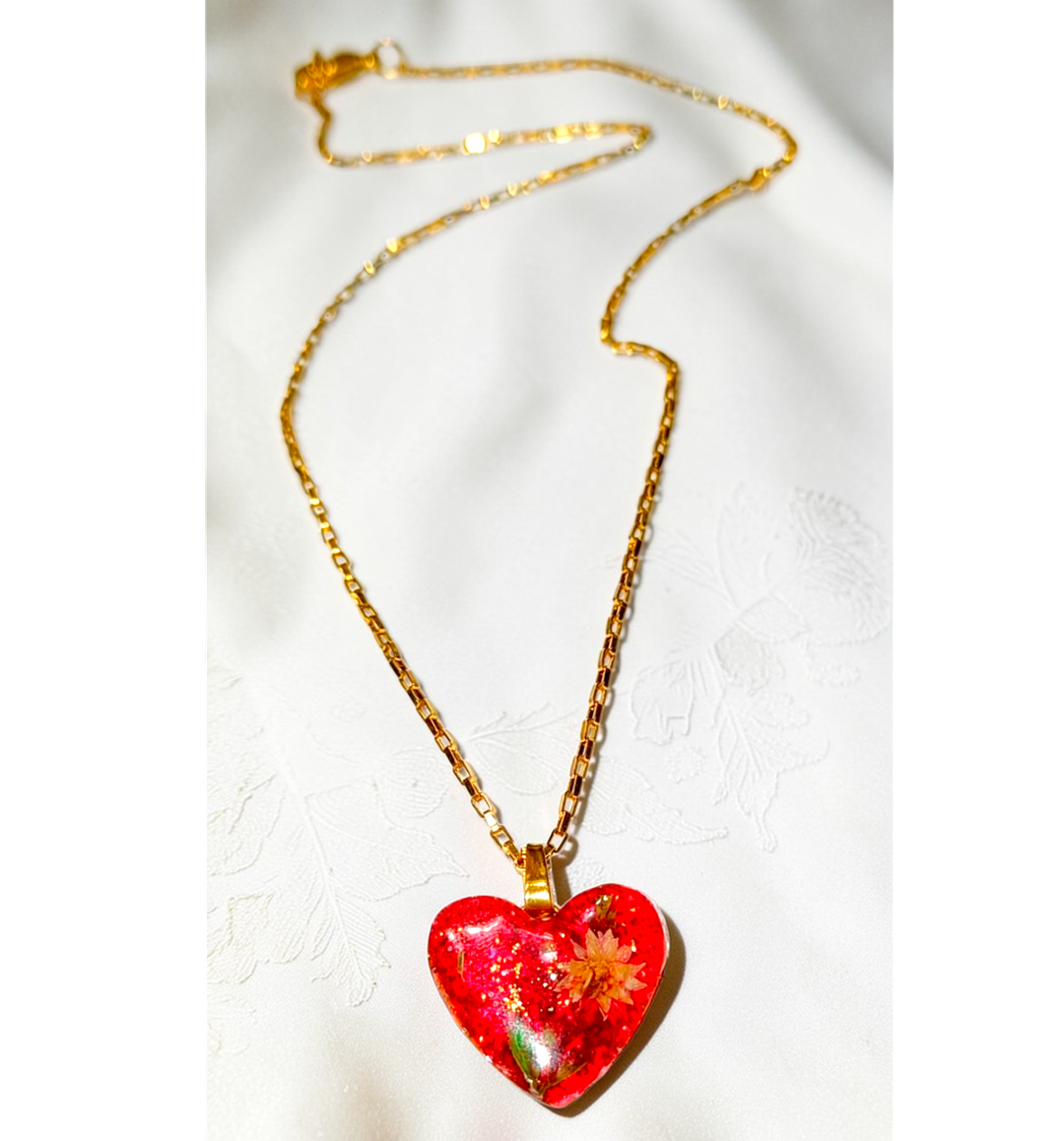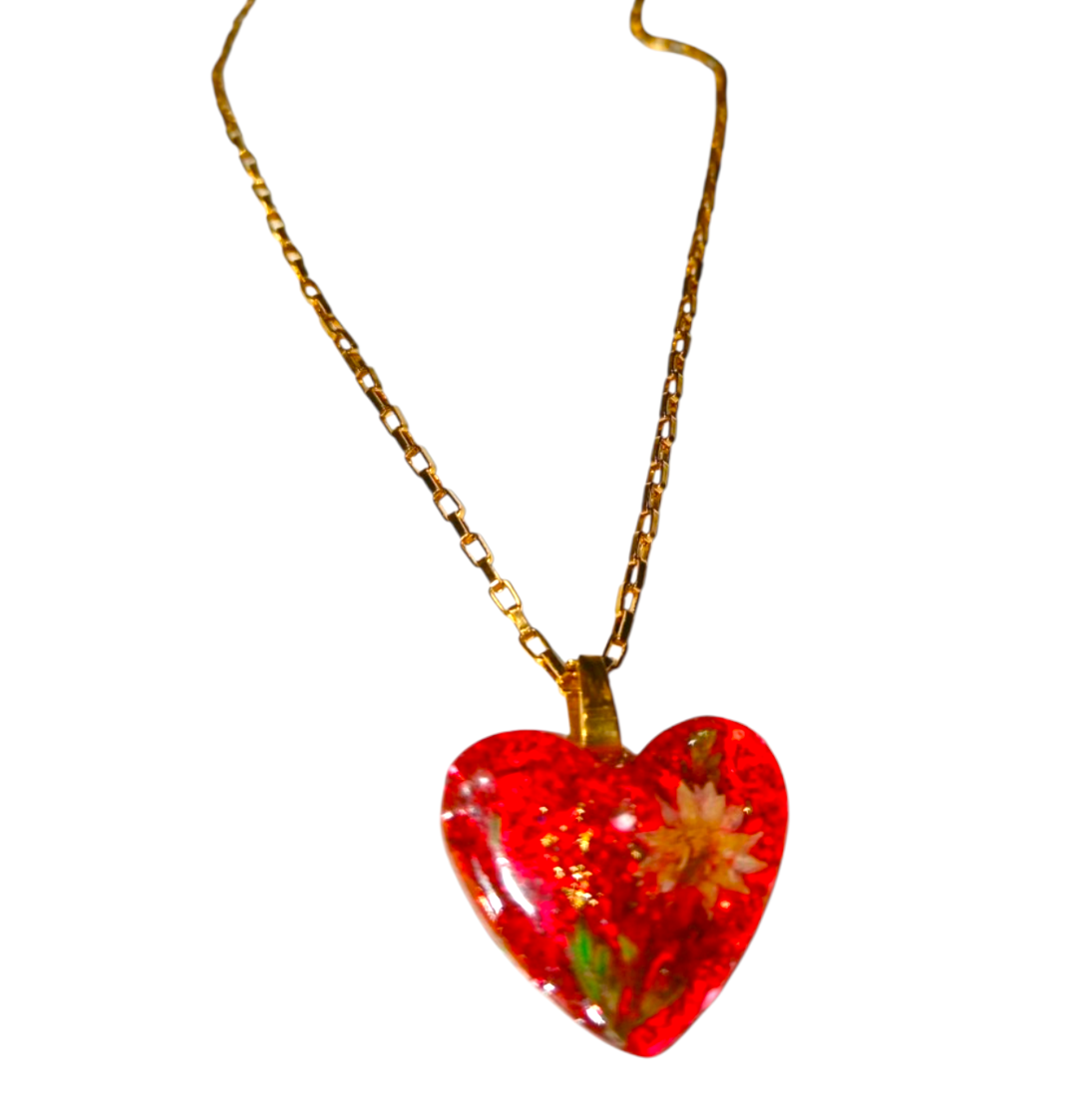 Χειροποιητο Κολιε -Καρδια- με φυσικα λουλουδια και gliter σε καρδια απο υγρο γυαλι.